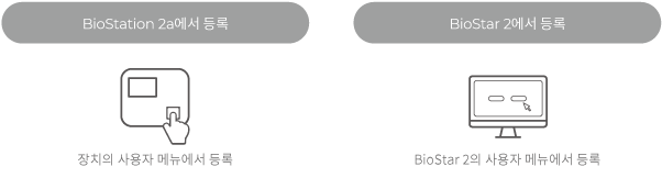 지문은 아래와 같은 방법으로 장치에서 직접 등록하거나 BioStar 2에서 등록할 수 있습니다.