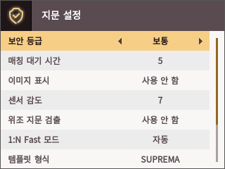 템플릿 형식: 지문 템플릿 형식을 설정할 수 있습니다. SUPREMA가 기본으로 설정되어 있으며, 템플릿 형식을 변경할 경우 이전에 저장된 모든 지문을 사용할 수 없으므로 변경 시 유의하세요.