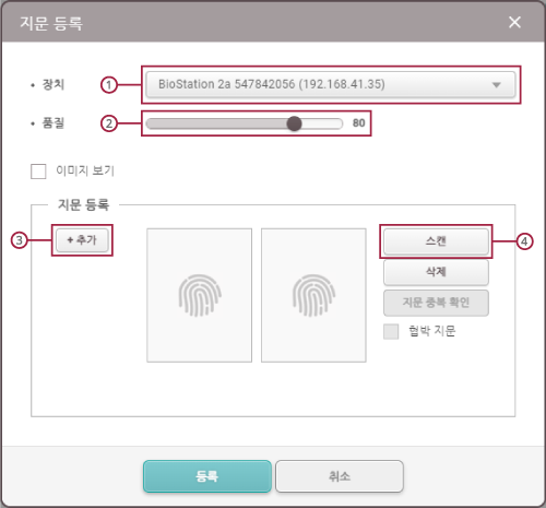 4. BioStation 2a 장치를 선택하고 지문 등록 품질을 설정한 후 + 추가를 클릭하세요.