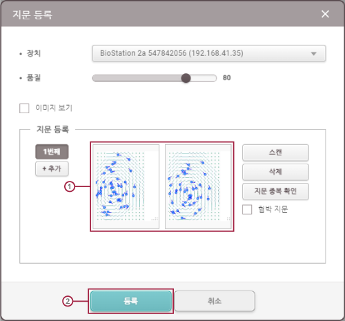스캔을 클릭하면 장치에서 지문 스캔이 시작됩니다. BioStation 2a 장치에서 지문을 스캔하세요.