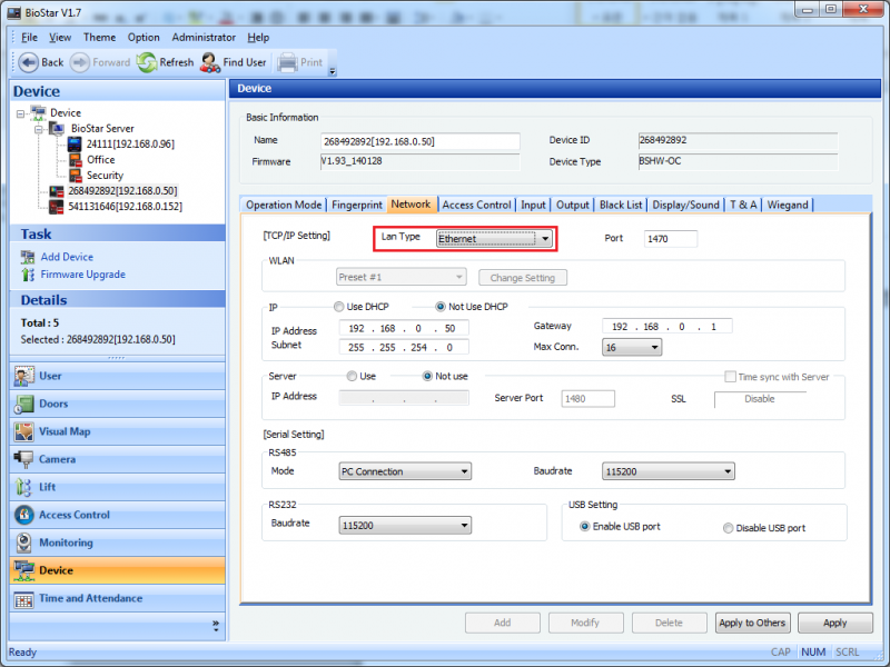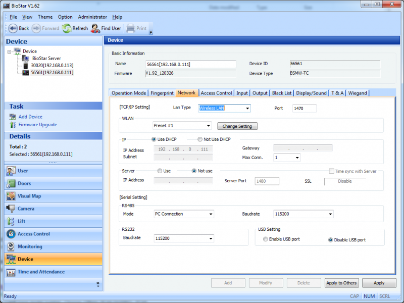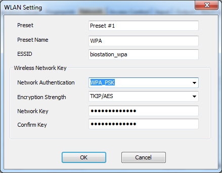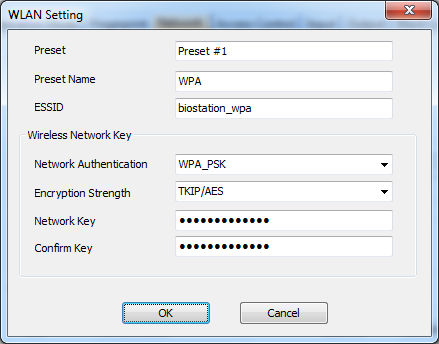 Old revisions Add to book Export to PDF Fold/unfold all Book Creator Add this page to your book Book Creator Remove this page from your book Manage book (0 page(s)) Help BioStar 1, WLAN How to configure the WLAN settings BioStation (BSMW) can connect to BioStar through a Wi-Fi network and it works in the same way that it works on the LAN. 1. Go to the Network tab of the Device page on the BioStar client application. Change Lan Type to Wireless LAN. 2. Click Change Setting. This will bring up the WLAN Setting dialog. 3. Configure the Wi-Fi Settings based of the type of an access point that you want to connect to. Note that BioStation does not support WPA2. Then click OK. 4. Change the Lan Type option to Ethernet. 5. Click Apply to transfer the settings to the device. 6. Enter the menu of a device and go to Network > TCP/IP < F1 More > F3 WLAN. 7. Check if the settings are properly transferred. 8. Press ESC and change LAN Type to Wireless LAN and press OK.
