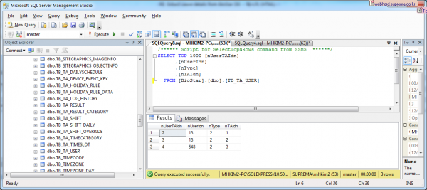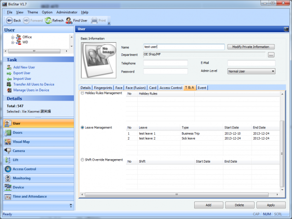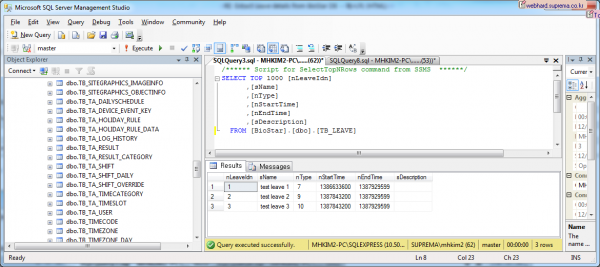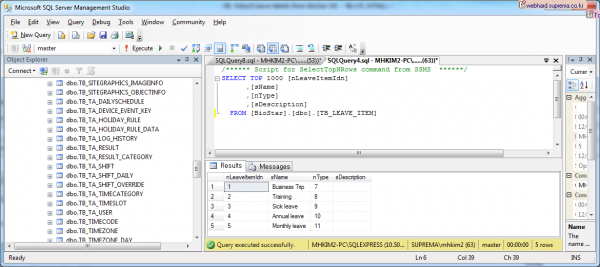Old revisions Add to book Export to PDF Fold/unfold all Book Creator Add this page to your book Book Creator Remove this page from your book Manage book (0 page(s)) Help BioStar 1, Database How to get leave data from the BioStar database Let’s say a user added two leaves, as shown in the figure below: You can find leaves added to users from table TB_LEAVE. You can find which type these leaves are of from table TB_LEAVE_ITEM. Compare the column nType in both tables. You can find who have these leaves from table TB_TA_USER. You can use columns nTAIdn and nUserTAIdn as a matching key.