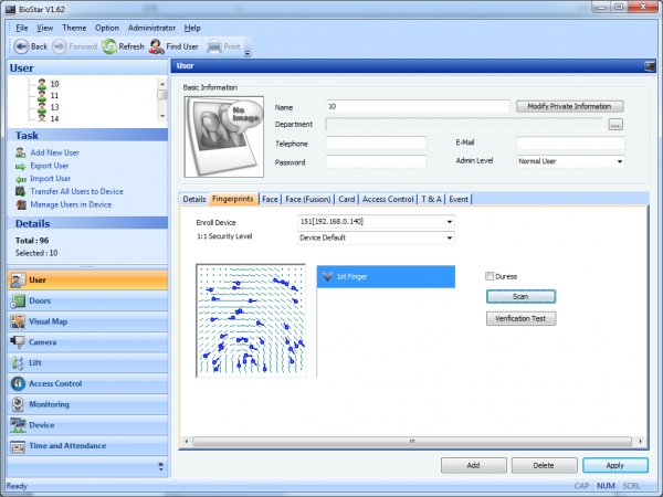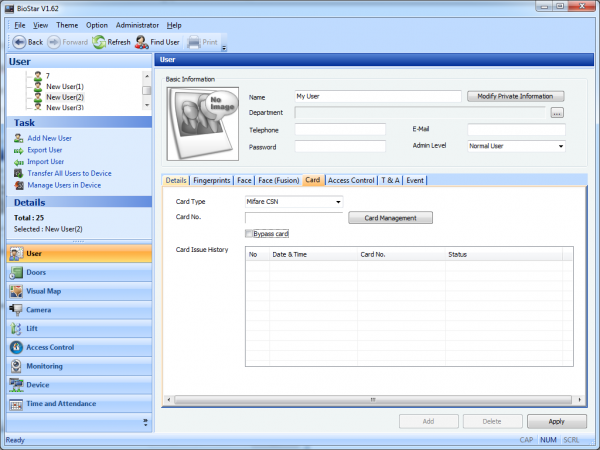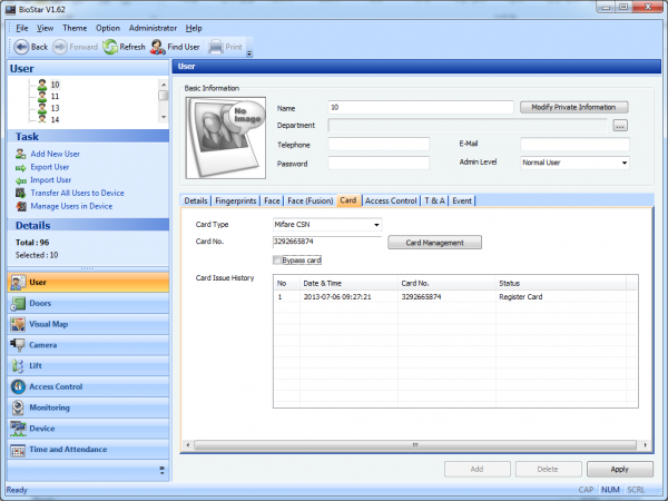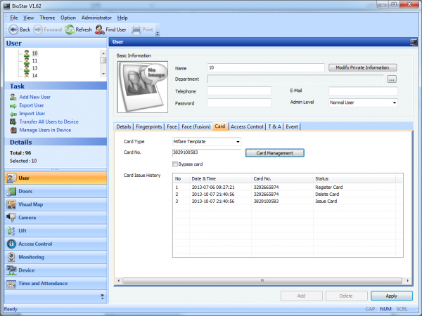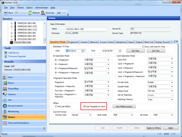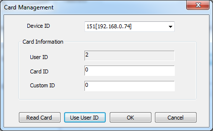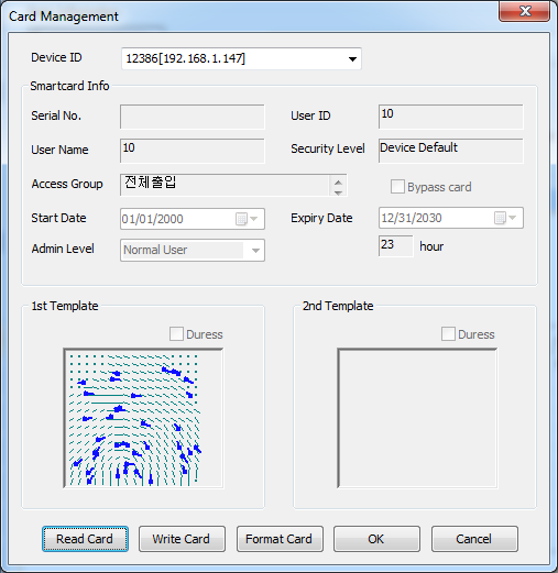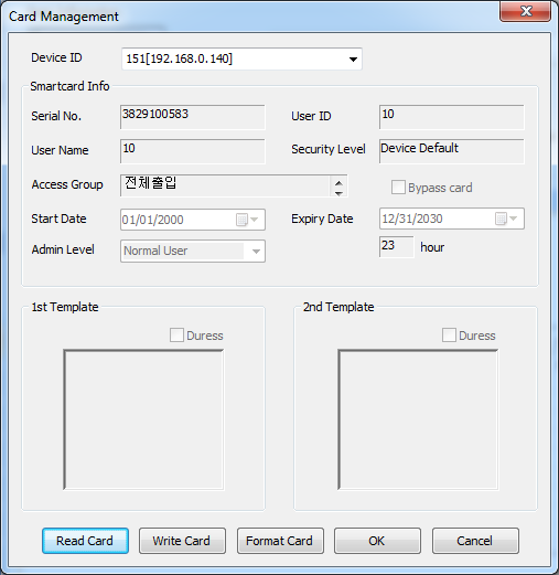 Old revisions Add to book Export to PDF Fold/unfold all Book Creator Add this page to your book Book Creator Remove this page from your book Manage book (0 page(s)) Help BioStar 1, Card How to issue a card BioStar supports four types of cards: EM, HID, Mifare CSN and Mifare Template cards. How to issue EM, HID, and Mifare CSN cards 1. Go to the User page, choose a user to whom you want to assign a card in the User pane and click the Card tab. 2. Click Card Management and this will bring up the Card Management dialog. 3. Choose a device you want to use as a card reader from the Device ID drop-down list and click Read Card. 4. Click Apply to complete the card issuance process. How to issue a Mifare Template card 1. You need to set the Use Template on Card option to allow users to verify themselves using their Template cards. You can set this option on the Operation Mode tab of the Device page: Make sure that your device supports the Mifare card reading feature. The model name ends with 'M' like BEPM, BSM and BLNM if the device supports the Mifare card reading feature. 2. Go to the Fingerprints tab on the User page and click Add to add a fingerprint to the user. Then, click Apply. 3. Go to the Card tab on the User page, choose Mifare Template from the Card Type drop-down list and click Card Management. 4. Click Read Card to read the card serial number of a card. The card serial number will be shown in the Serial No. field after reading the card. 5. Click Write Card to write the user information onto the card. Then, click OK. 6. Click Apply to complete the Template card issuance process.