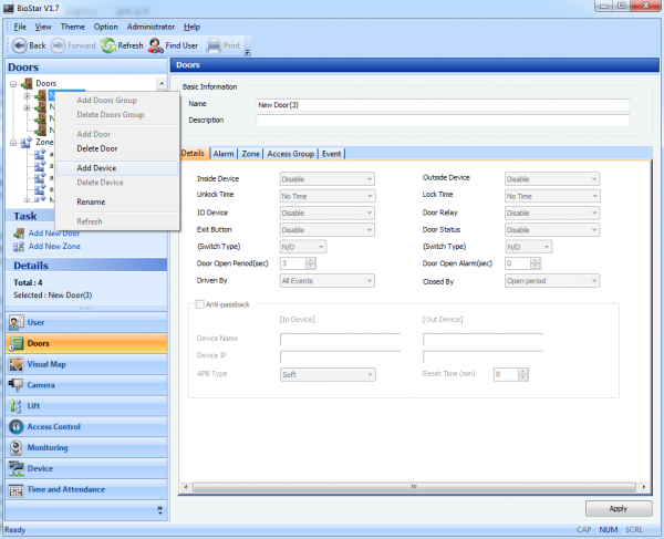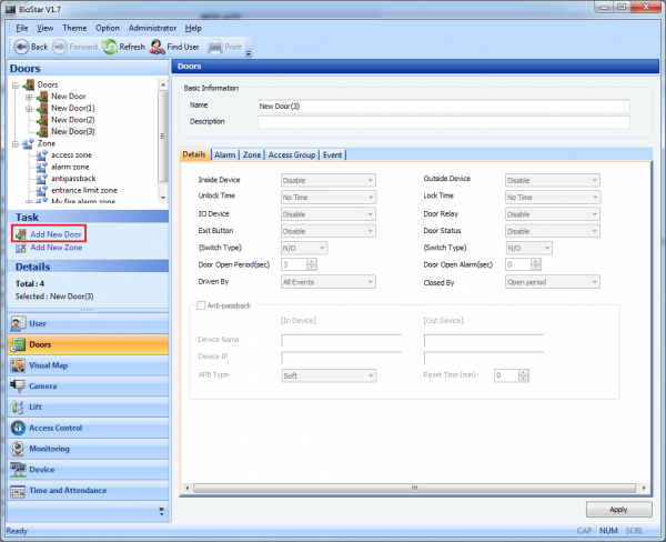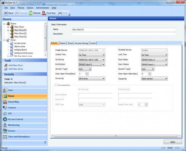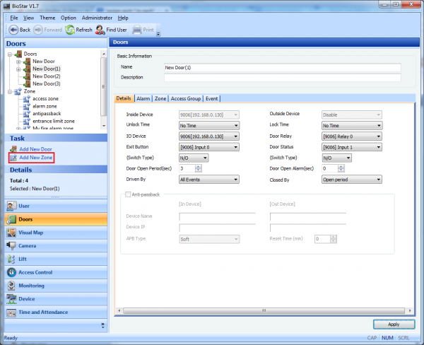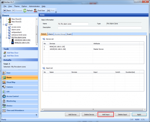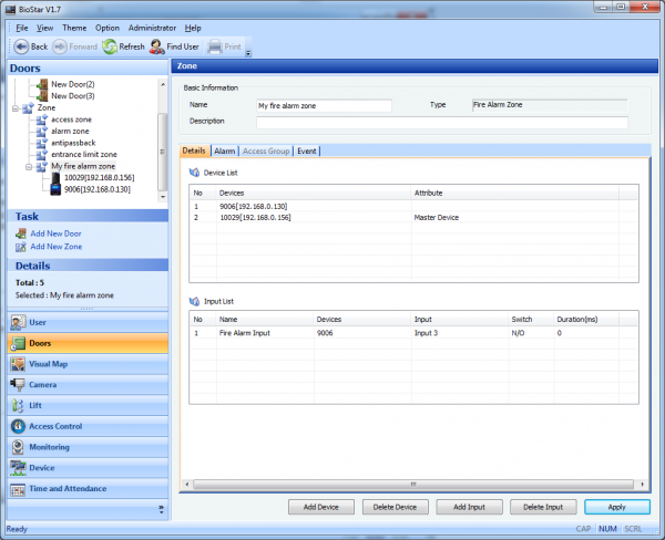 Old revisions Add to book Export to PDF Fold/unfold all Book Creator Add this page to your book Book Creator Remove this page from your book Manage book (0 page(s)) Help This is an old revision of the document! BioStar 1, Fire Alarm, Zone How to set up a fire alarm zone All the devices that are in a fire alarm zone will automatically open their doors when the fire alarm sets off. The alarm is detected through an input port set in the configuration of the zone. You can set up a fire alarm zone by performing the following steps: 1. On the Doors page, click Add New Door. 2. If devices are connected via the Ethernet, assign one device to one door. For example, if you have two devices, you need to make four doors and assign each device to each door. If devices are connected via RS485, you can assign up to two doors to one door. 1) Right-click a door and choose Add Device. 2) Choose one of the devices you want to add on the Device Tree dialog and click OK. 3. You need to be very careful about the settings of the door. When an input for fire alarm trigger is assigned for Exit Button or Door Status, then the input for fire alarm trigger will be overridden by the settings of the door. For example, when Input 0 and Input 1 are already assigned to Exit Button and Door Status as shown in the figure below, you should use a different input (such as Input 2 or 3) for fire alarm trigger. 4. click Add New Zone. 5. Enter a name for the fire alarm zone and choose Fire Alarm Zone from the Type drop-down list. 6. Click Add Device to add devices to the zone. This brings up the Add Device dialog. 7. Choose devices you want to add and click the right arrow button and then the Save button. One of the devices will be automatically selected as Master Device. 8. Click Add Input to determine the input type for the zone. The input specified here will be used to set off the fire alarm. 9. Configure the settings and click OK. In this example, we use Input 3 for fire alarm trigger since we've already used Input 0 and 1 for other purposes. 10. Click Apply to transfer the settings to the devices. When you release the fire alarm, all the doors will not close at once. In the Monitoring menu you will have to check the status of each door and set it back to normal to close the doors.