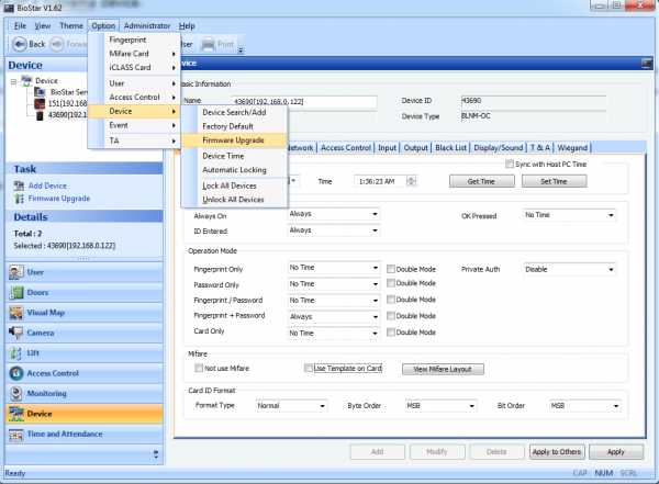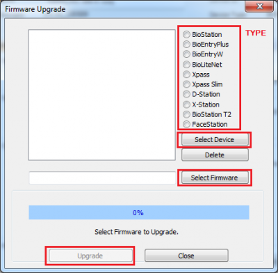 Old revisions Add to book Export to PDF Fold/unfold all Book Creator Add this page to your book Book Creator Remove this page from your book Manage book (0 page(s)) Help BioStar 1, Firmware, Upgrade How to upgrade firmware of your Suprema device We periodically release firmware updates for all products. It is highly recommended to install the latest firmware on your device. You can download the latest firmware updates from the link that BioStar 1_FW(the latest version) to see the list of the latest firmware updates. After downloading the firmware, you can upgrade the firmware of your device by performing the following steps: 1. Go to Option > Device > Firmware Upgrade as shown in the figure below. This brings up the Firmware Upgrade dialog. 2. Select the type of the device on which you want to install the firmware. 3. Click Select Device, choose the device from the Device Tree dialog and then click OK. 4. Click Select Firmware and choose the firmware file. 5. Click Upgrade. 6. The device will be automatically restarted after the firmware update is completed. Then, click Close. See Also FW Compatibility Chart