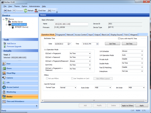 2. On the Operation Mode tab of the Device page, set Format Type to Wiegand and click Apply.