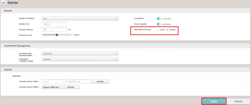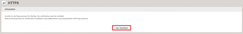 Old revisions Add to book Export to PDF Fold/unfold all Book Creator Add this page to your book Book Creator Remove this page from your book Manage book (0 page(s)) Help This is an old revision of the document! BioStar 2, HTTPS How to change from HTTP to HTTPS Can we use HTTPS for BioStar 2? Yes, the BioStar 2 support secure communication protocol called HTTPs between the BioStar 2 Server and the BioStar 2 Clients. HTTPs consists of communication over HTTP with encryption of Secure Socket Layer. This will provide protection of the privacy and the integrity of the data exchanged between the BioStar 2 Server and the BioStar 2 Clients. To enable HTTPS protocol 1. Login the BioStar 2 as an Administrator account. 2. Go to Setting > SERVER. 3. To enable HTTPS protocol, select HTTPS for Web Server Protocol and then click Apply. 4. Open BioStar Setting program (All programs > BioStar 2 > BioStar Setting) and make sure that all service is up and running. You may have the port 443 already designated for another application as displayed below and in this case, make sure you assign the unoccupied HTTPS Port and then click Start to run the service. 5. Try open the BioStar 2 web page along with the HTTPS port as displayed below. 6. The following error page may appear due to the security certificate presented by current BioStar 2 server is not issued by the trusted certificate authority. If your organization do not have public SSL certificate and want to get rid of the following error message, you can proceed with the following steps to issue a private security certificate using a tool provided by Suprema. Please select Advanced option and click Proceed to xxx.xxx.xxx.xxx(unsafe) for the temporary access. 7. Once again, login with the administrator account. 8. Go to Setting > HTTPS which is newly created menu when you switch the Web Server protocol to HTTPS. 9. Click Cert.Download button to obtain a file named cert-register.zip. 10. Unzip the cert-register.zip and run cert-register.exe file. 11. On the Enrollment Certification window, please enter the ip address of BioStar 2 server along with the HTTPS port you assigned on step 4 and then click Enrollment button. 12. Read the Security Warning message and if you are happy to proceed, please click Yes. 13. Once the tool successfully installed the certificate, you will see the following window to complete the process. Please click OK to confirm it. 14. To verify the installation, restart the web browser and try open the BioStar 2 web page. Make sure error message you encountered on step 6 is no longer presented.