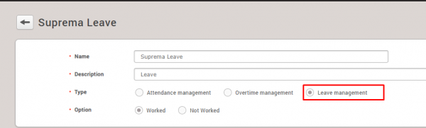 2)Check on “Leave Management” tab of Type, set the name and description, and then create it by clicking Apply
