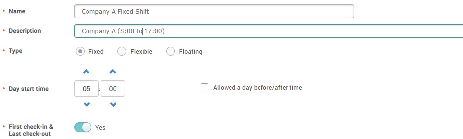 3. Set Type as Fixed, Day start time as 05:00 and allow First check-in & Last check-out option.