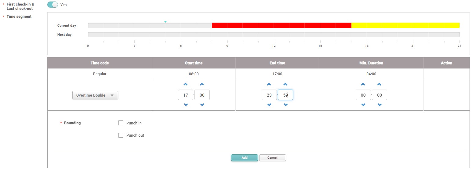 7. Select a Overtime double pay code from a drop down list and set Start time to 17:00 and End time to 23:59.