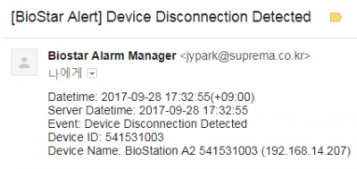 Old revisions Add to book Export to PDF Fold/unfold all Book Creator Add this page to your book Book Creator Remove this page from your book Manage book (0 page(s)) Help This is an old revision of the document! System Configuration, BioStar 2 How to send Email when a device is disconnected From BioStar 2.5.0, you can configure an Email about the device disconnection detected. When a device is disconnected, the email will be sent to a recipient you set. Go to Setting > Trigger & Action. Select the certain device. Then, check the box named Device Disconnection Detected and Biostar. Click to configure the email server information. Then, type the information on your email server. When it comes to setting of SMTP Option, refer to below screenshot. If you are not sure what the settings are, please ask your IT administrator. Add a Recipient and click Apply button. When the device is disconnected, an email titled “[BioStar Alert] Device Disconnection Detected” will be set to the recipient you add.