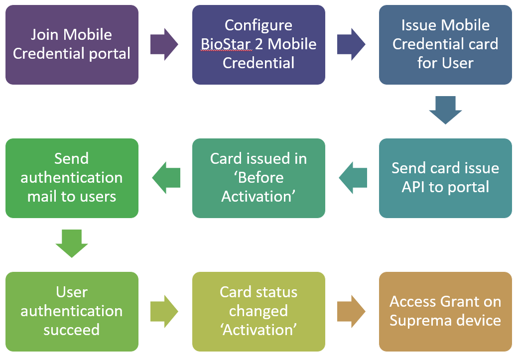 Old revisions Add to book Export to PDF Fold/unfold all Table of Contents How to Use 'Suprema Mobile Credential' 1. Basic flow to issue Suprema Mobile Credential 2. Additional information for Mobile Credential 3. Links for information about Mobile Credential 4. Mobile Credential Q&A This is an old revision of the document! How to Use 'Suprema Mobile Credential' Before the BioStar v2.7.12, BioStar 2 user credentials were fingerprint, face and card. But from the BioStar v2.7.12, the new credential, Suprema Mobile Credential, is supported. With Suprema Mobile Credential, you can use your smartphone as a credential and access doors, gates and more. Through Suprema Mobile Credential, you can meet improved user convenience and easier way to support 3rd party controller. Contents in this page are about how to setup the Suprema Mobile Credential for BioStar 2 usage. Links for extra information about Suprema Mobile Credential are listed up on the bottom of this page. Suprema Mobile Credential and BioStar 2 Mobile Card are different products. CANNOT enroll a new Suprema Mobile Credential directly from Suprema devices; assign through the BioStar 2 or manually input the card number. If you have Suprema devices which are already in use - include XPass 2, you need to remove all user data in the device, delete the device from BioStar 2 and reset the device before starting Mobile Credential. Check the linked article which describes sample steps for your case. (Link) 1. Basic flow to issue Suprema Mobile Credential The basic Suprema Mobile Credential issue process is as below. You can find a sample 'How-To' recording from Step 1) to Step 6) in the following link. How to Issue Mobile Credential from BioStar 2 1) Join Mobile Credential portal Portal address : http://mc.suprema.io Create your site and purchase credits. 2) Configure BioStar 2 Mobile Credential BioStar 2 Mobile Credential setting should be based on the portal site data. Email, Password : the data of the user who signed in the portal. Site ID : the site ID which user created through the portal. Domain : https://api.mc.suprema.io (default) Port : protocol port number of portal site (default) 3) Issue Mobile Credential card for user When you set 'Use' for Mobile Credential, you can find 'Mobile' button from user detail page. 4) Send card issue API to portal Please remind that the 'Credit' will deduct in this step. Issue new Mobile Credential card. Re-issue the current Mobile Credential card. Re-issue the 'Before Activation' status Mobile Credential card. When you re-issue the Mobile Credential card, the former data becomes invalid. If a same user ID does not exist in CSV file, you can get user data through 'Preserve Data' or 'Overwrite'. If a same user ID exists in CSV file, you can get user data through 'Overwrite'. 5) Card issue in 'Before Activation' status You can check from the portal site, not from the BioStar 2. 6) Send SMS or Email to users for authentication according to the portal message option You need to make sure that requested field is correctly filled in. e.g. If the message option is 'Email', then the 'Email' field in 'BioStar 2 > User > Information > Email' should have data. If you use SMS type, then '+' sign and country code are mandatory as SMS messaging operates when the phone number is ('+' + 'country code' + 'phone number'). 7) User authentication succeed When the user finished user authentication through received SMS or Email, Mobile Credential card will be issued correctly. 8) Card status changes into 'Activation' status in portal You can check the status change from the portal site, not from the BioStar 2. 9) Access Grant on Suprema devices You can get an access grant among devices which registered for the site. 2. Additional information for Mobile Credential When you issue the Mobile Credential card, you can put character, ' ' (space), number and '_' (under bar) for user name. When you use SMS message type for authentication, the phone number should start with '+' sign. Phone number is limited 8 to 15 numbers. If the card is blocked, the card number will be updated in 'Setting > Card > Blacklisted Card'. If you delete users (delete selected users / delete all users), then issued cards will be automatically deleted from the Mobile Credential portal. Even though you delete all users, Administrator user will remain and the Mobile Credential card for Administrator will be kept. 3. Links for information about Mobile Credential Suprema official website - Mobile Credential page : Suprema Mobile Credential Suprema Mobile Credential portal : Link Suprema Mobile Credential portal user guide : Link MOCA system Youtube channel : Link 4. Mobile Credential Q&A Q 1 > How can we get the Mobile Credential License Policy and how can we purchase Mobile Credential Credits? A 1 > Please contact your Suprema regional sales representative. If you do not know the exact sales representative, please contact Suprema through our official web site. (Link) Q 2 > What is difference between Suprema Mobile Credential and BioStar 2 Mobile Card? A 2 > Please follow the linked article which is about your answer. (Link) Q 3 > Can we keep using BioStar 2 Mobile Card if we has been used? How does the policy go for BioStar 2 Mobile Card? A 3 > Please check the linked page to get more detailed information. Login is required to check the link. (Link)