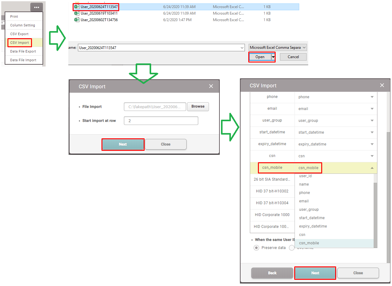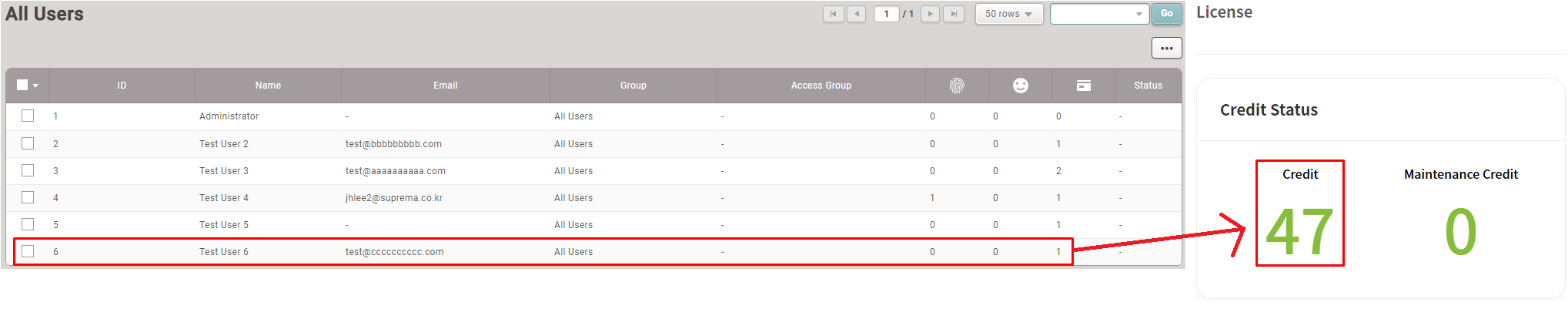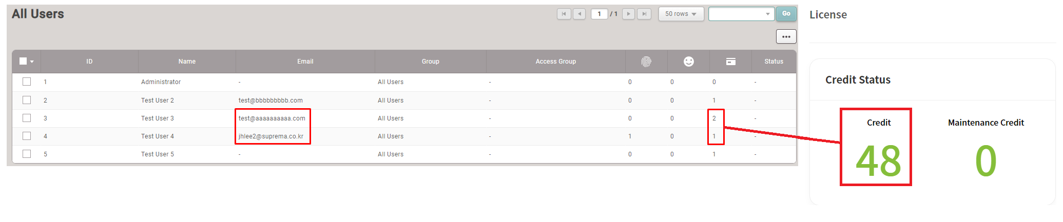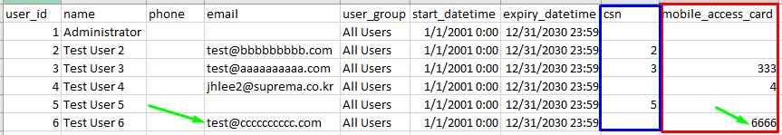 Old revisions Add to book Export to PDF Fold/unfold all Table of Contents Issuing Suprema Mobile Access Cards via BioStar 2 User CSV Import Step 1> Go to BioStar 2 > Settings > Mobile Access and connect with your Site which you created in Airfob Portal. Step 2> Create a CSV file which has user information. Step 3> Import User CSV file in BioStar 2 > Users according to the following steps. Step 4> Check your Airfob Portal, then you can find the total number of credit has been decreased. Issuing Suprema Mobile Access Cards via BioStar 2 User CSV Import Sometimes, you may face situations in which you must register multiple cards to a user at once. For such cases, you can investigate with CSV Import feature in BioStar 2 > User menu. In the same way you register normal RF cards, you can register Mobile Access cards via BioStar 2 CSV Import feature. The following steps are examples of how to issue multiple Suprema Mobile Access cards at once via CSV Import. Step 1> Go to BioStar 2 > Settings > Mobile Access and connect with your Site which you created in Airfob Portal. Detailed steps are described in the linked article. [BioStar 2] How to Use Suprema Mobile Access Step 2> Create a CSV file which has user information. If you are using normal CSN card (RF card) and Mobile Access card at once, please make sure to separate two card types in two columns. We will add 'Test User 6' with Mobile Access cards as the image below. Step 3> Import User CSV file in BioStar 2 > Users according to the following steps. You should map Mobile Access card column with 'csn_mobile' column. Although you import a CSV file containing user information that already exists, the previously issued Mobile Access cards will not be reissued. Please be aware of mapping columns in 'BioStar 2 > User > CSV Import'. If you map csn_mobile column with wrong RF card column, then total number of credit will be automatically decreased and you CANNOT revert wrongly issued mobile access cards. Step 4> Check your Airfob Portal, then you can find the total number of credit has been decreased. Credit in Airfob Portal is deducted as much as the number of newly issued Mobile Access cards. <Before import CSV file> <After import CSV file>