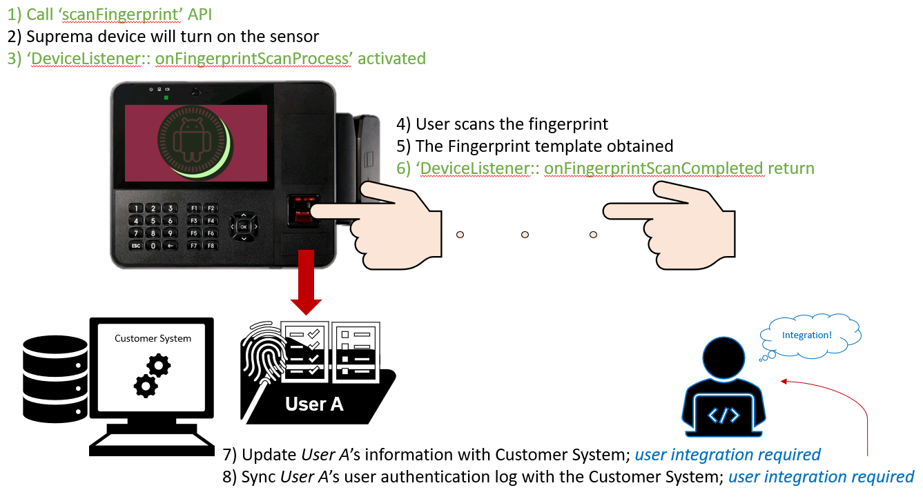 Old revisions Add to book Export to PDF Fold/unfold all Table of Contents Possible integration options 2 What SVP Android SDK Is What Omnis And Novus Are How To Integrate Your System with SVP Android SDK Sample Operation Diagram with SVP Android SDK Book Creator Add this page to your book Book Creator Remove this page from your book Manage book (0 page(s)) Help This is an old revision of the document! Possible integration options 2 Before we had the SVP Android SDK, you had to use Suprema products in two ways; BioStar 1/2 SW + Suprema Device + Official FW BioStar 2 Device SDK + Suprema Device + Official FW If you need to operate your system with Suprema devices as your preference, you had to integrate with BioStar Device SDK from the server side and request for the customized firmware. However, from now, you can develop your own firmware and make the device to work with your system without server side modification. What SVP Android SDK Is The Suprema Versatile Platform (SVP) Android SDK is a programming interface designed to take advantage of the core functions of Suprema devices in other software. The SDK is made up of a set of APIs that make it easy to use the Suprema device's functionality for developing solution applications for time and attendance on Android. What Omnis And Novus Are Omnis is the Suprema's first SVP Android SDK applicable device whose hardware is based on BioStation A2. Novus is the Suprema's another SVP Android SDK applicable device which is the brand new product. With both devices, you can create your bespoke Time & Attendance / Workforce Management and Multimedia Workstation. [Figure 1. Omnis Novus Specification] Caution You cannot change the BioStation A2 device to the OMNIS or the revert way by yourself. Please contact your regional sales representative to get more information about the Omnis and the Novus. Regional Sales Representative Contact Info How To Integrate Your System with SVP Android SDK SVP Android SDK is targetted for the sites where the full Time & Attendance system already exists. Before the SVP Android SDK released, you had to integrate a part of your server with BioStar Device SDK to get an interoperable system with Suprema biometric devices. But with SVP Android SDK, you can create your own application to use Suprema biometric solution. Unlike BioStar Device SDK, SVP Android SDK supports less APIs then before. As we mentioned, SVP Android SDK is for creating your customized firmware as an Android application, Suprema supports the basic APIs for operating the device and biometric solution. The latest version supports 32 APIs and 9 callback functions so the limitation of integration get reduced. For example, saving logs were mandatory for original Suprema devices and BioStar SDK supports Log APIs to manage logs, however, there is no Log APIs in SVP Android SDK. If you want to save logs in the device, collect and manage with your system, you can develop the features through basic Android APIs. The following table is a comparison between BioStar 2 Device SDK and SVP Android SDK. [Figure 2. BioStar 2 Device SDK vs SVP Android SDK] In the same manner as the BioStar Device SDK, SVP Android SDK supports online guide from installation to API description. You can check up the SVP Android SDK's online guide from the link below. Suprema Knowledge Base for SVP Android SDK Download Link for SVP Android SDK : link Sample Operation Diagram with SVP Android SDK