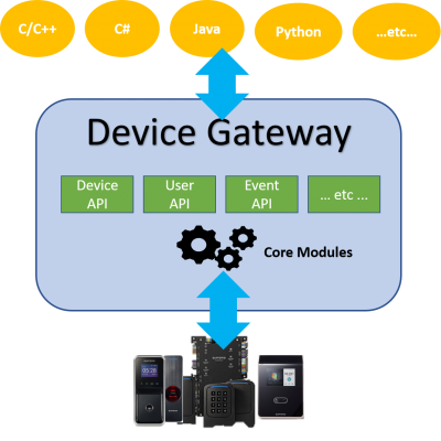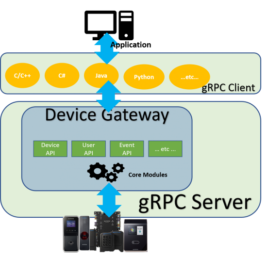 Old revisions Add to book Export to PDF Fold/unfold all Book Creator Add this page to your book Book Creator Remove this page from your book Manage book (0 page(s)) Help This is an old revision of the document! Possible Integration Option 3 : G-SDK In addition to the integration method using BioStar2 SW API or BioStar2 Device SDK, G-SDK is recently released as a new integration option for device management, user management, and log management. What is G-SDK? G-SDK is one of the integration options for communicating with BioStar 2 devices. It is a lightweight, scalable, and cross-platform solution which will expedite your development. How G-SDK works? [Figure 1. G-SDK architecture] G-SDK consists of Device Gateway in gRPC Server and gRPC Client Libraries. Based on gRPC, it supports many programming languages such as Java, C#, Python, Node.js, Go, etc. (gRPC (gRPC Remote Procedure Calls) is an open source remote procedure call (RPC) system initially developed at Google in 2015.) Multi-language support Language-neutral IDL Native client libraries Device Gateway that communicates with BioStar 2 device can be run on a server or cloud. Core modules use BioStar 2 protocols and written by GO language. [Figure 2. Device Gateway Structure]