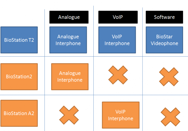 Old revisions Add to book Export to PDF Fold/unfold all Table of Contents SIP based VoIP server for BioStation A2 & FaceStation 2 Configuration Guide Utilized Protocols Comparison of Interphone Options Book Creator Add this page to your book Book Creator Remove this page from your book Manage book (0 page(s)) Help System Configuration, BioStation A2, VoIP, SIP, videophone SIP based VoIP server for BioStation A2 & FaceStation 2 Configuration Guide The BioStation A2 videophone feature is now available with the release of BioStar 2.3. To use the videophone, you need a firmware version of 1.2 or later and a SIP-based VoIP server. Please refer to the attached document regarding the setup and configuration of a SIP-based VoIP Server. The VoIP feature is also possible with FaceStation 2 which was introduced with BioStar 2.4.1. sip_server_configuration_guide_for_a2.pdf Officially only local Asterisk VoIP server is supported. We don't guarantee usability with other services currently. Following codecs are utilized: Video: VP8, H264 with resolutions up to 1080P, MPEG4 Optimized for H.264 codec Video call is possible when the user calls from the device. You will need a SIP client that supports the feature. Utilized Protocols Internal tests were done with a PC app of Linphone and MicroSIP. We cannot guarantee that the feature will work for SIP phones (hardware) because SIP Phones do not support all SIP versions. If you would like to use a hardware SIP phone, make sure that the below protocols are supported. - Session Initiation Protocol, RFC 3261 8. General User Agent behaviour 9. Cancelling a request 10. Registrations 12. Dialogs 13. Initiating a session 14. Modifying an existing session 15. Terminating a session 17. Transactions 18. Transports 22.4 The Digest Authentication Scheme - Session Initiation Protocol (SIP): Locating SIP Servers, RFC 3263 - Session Description Protocol, RFC 4566 - An Offer/Answer Model with the Session Description Protocol (SDP), RFC 3264 - An Extension to the Session Initiation Protocol (SIP), RFC 3581 (use of rport parameter) - Session Initiation Protocol (SIP) INFO Method and Package Framework, RFC 6086 4. The INFO Method - The Session Initiation Protocol (SIP) Refer Method, RFC 3515 2. The REFER Method - Session Description Protocol (SDP) Security Descriptions for Media Streams, RFC 4568 - Managing Client-Initiated Connections in the Session Initiation Protocol (+sip.instance parameter), RFC 5626 - Connection reuse in the Session Initiation Protocol (alias parameter), RFC 5923 - Correct Transaction Handling for 2xx Response to Session Initiation Protocol (SIP) INVITE Requests, RFC 6026 - A privacy mechanism for the Session Initiation Protocol, RFC 3323 - Private Extensions to the Session Initiation Protocol (SIP) for Asserted Identity within Trusted Networks, RFC 3325 - Interactive Connectivity Establishment (ICE), RFC 5245 - Traversal Using Relays around NAT (TURN): Relay Extensions to Session Traversal Utilities for NAT (STUN), RFC 5766 - Session Traversal Utilities for NAT (STUN), RFC 5389 - Traversal Using Relays around NAT (TURN) Resolution Mechanism, RFC 5928 - Re-INVITE and Target-Refresh Request Handling, RFC 6141, chpt. 5 only - Reliability of Provisional Responses in the Session Initiation Protocol (SIP), RFC 3262 Comparison of Interphone Options If you're familiar with BioStation T2's videophone functionality, refer to the details below to understand the difference between BioStation T2 and BioStation A2 videophone. With BioStation T2, you have three different options to use the videophone: 1) BioStar Videophone This is a standalone software application made by Suprema and communicates with BioStation T2 through Suprema’s proprietary protocol. Even though you can’t use BioStation T2 with other 3rd party phones like SIP-based phones or analog phones, it’s a good option for small-sized companies just for simple communication and door control. 2) VoIP You can also use BioStation T2 with a SIP-based VoIP server. This is a good option for mid and large-sized companies, because you can utilize the existing VoIP infrastructure. Even though SIP protocol supports video streaming, BioStation T2 does not support video streaming and only supports audio. The main difficulties for using VoIP is you have to install VoIP server if you do not have the existing VoIP infrastructure. One of the most popular SIP-based VoIP server is Asterisk server http://www.asterisk.org/. 3) Analog videophone You can use Commax’s analog videophone with BioStation T2. With BioStation A2, you have only one option to use the Videophone: 1) VoIP You can use BioStation A2 with a SIP-based VoIP server. Unlike BioStation T2, BioStation A2 supports video streaming as well. We have tested BioStation A2 with Asterisk Server and mobile and Windows SIP clients. Refer to the image below to understand the different options for interphones: