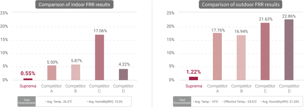 Old revisions Add to book Export to PDF Fold/unfold all Book Creator Add this page to your book Book Creator Remove this page from your book Manage book (0 page(s)) Help This is an old revision of the document! Fingeprint Algorithm, FRR, Dry fingerprint Suprema's fingerprint recognition algorithm against dry fingerprints “Suprema provides performance that is about 31 times higher than competitor” In the winter in South Korea, the temperature falls, and it becomes windy, so the humidity in the air drops consequently. As a result, your skin becomes dry, leading the oils and moisture in it to dry. Therefore, in winter, even correctly touching the surface of a fingerprint sensor with your fingertip can generate a dry fingerprint, which cannot be correctly recognized. In addition to being affected by seasonality, dry fingerprints can also easily occur in geographically dry regions, such as South Africa, Australia, and the Middle East. The occurrence of dry fingerprints is also very dependent on the individual’s occupation and age. For example, dry fingerprints can occur with people who are required to frequently disinfect their hands at work, such as doctors and workers who handle wood, leather or metal, as well as with elderly people and people with dry skin (xeroderma). When a dry fingerprint occurs, the person’s fingertip hasn’t properly come in contact with the surface of the fingerprint sensor, and as a result, a blurry fingerprint image is generated. A blurry image of a fingerprint makes it more difficult to extract the fingerprint’s minutiae than a normal one and is more likely to result in the extraction of false minutiae. Therefore, dry fingerprints eventually lead to a higher false rejection rate (FRR). Even when there is a dry fingerprint problem, you can temporarily eschew it by blowing on your hands or applying hand cream to the fingers before going through the fingerprint authentication process. However, such a measure is not a fundamental solution and therefore cannot guarantee the proper performance of fingerprint recognition. However, with Suprema's latest fingerprint sensor and algorithm, you can resolve such problems altogether. Outstanding indoor and outdoor authentication performance In either cold or dry environments, the state-of-the-art fingerprint sensor applied to Suprema's products demonstrates performance that far surpasses other companies’ fingerprint sensors. This difference in performance is not just a palpable kind. With its state-of-the-art fingerprint sensor and superlative algorithm, Suprema provides performance that is about 31 times higher indoors and about 19 times higher outdoors than other companies’ products. Comparison with other fingerprint matching algorithms Unlike the ordinary fingerprint matching algorithm, with Suprema's fingerprint matching algorithm, inputted fingerprint images are analyzed first by the Conformance Decision Engine (CDE), instead of sending them directly to the pre-processing stage. This Conformance Decision Engine (CDE) helps you obtain the correct fingerprint images even if fingerprints have been inputted in the wrong manner, by identifying instances such as when the fingerprint inputted has been produced by rubbing the surface of the fingerprint sensor with the fingertip. In addition, the acquired fingerprint images are analyzed based on deep learning technology and subsequently go through the algorithm optimization stage. This enables far faster provision of feedback to the user without having to go through the matching stage, because the fingerprint images are analyzed in advance, prior to the image pre-processing stage. Suprema's fingerprint matching algorithm makes it possible to obtain high quality fingerprint images because it effectively controls the fingerprint sensor and algorithm based on the Conformance Decision Engine (CDE), and for that reason, it is also excellent at eliminating false minutiae. Equipped with optimized algorithms and superlative computation performance, all Suprema products can complete fingerprint matching in less than a second even for dry fingerprints and demonstrate effective and reliable fingerprint matching performance in a variety of environments.