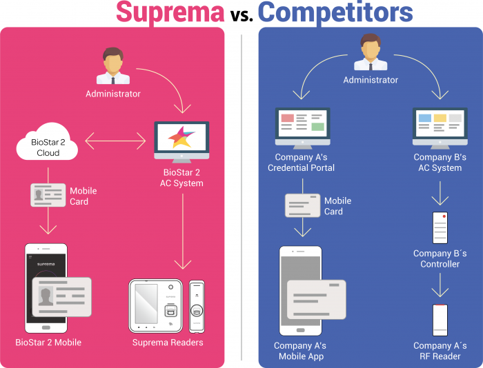 Old revisions Add to book Export to PDF Fold/unfold all This is an old revision of the document! BioStar 2 Mobile Card BioStar 2 Mobile Card The global smartphone penetration rate has already exceeded 50%, and the penetration rate in advanced markets has already reached 65%. There have been many attempts to actively utilize them in various fields in accordance with the rapidly spreading smartphones, and this is also the case with access control. If you can store your information and credential information from a smartphone that is used almost always in daily life instead of plastic cards that can be easily lost, you can secure security and convenience together. Systems that use smartphones as credentials for user authentication have already been developed by several companies, and systems using Bluetooth Low Energy (BLE) as well as Near Field Communication (NFC) technology have been developed. However, in order to use a mobile card, it is still necessary to get a card with a fee through a separate portal service or a separate recognition device is required. This situation is not different from the existing system. Suprema’s BioStar 2 mobile card can be issued directly from BioStar 2 or BioStar 2 Mobile app without using portal services like any other system. In addition, the BioStar 2 Mobile app, which allows you to directly control the functions of BioStar 2 or monitor system logs, is used together to provide users with a unified user experience (UX). A Single System for All. The BioStar 2 mobile card does not require a separate portal service. In the BioStar 2 or BioStar 2 Mobile app you are already using, the administrator can issue the mobile card directly, and you can use the mobile card just by registering it in BioStar 2 Mobile App. The process of collecting issued cards is not difficult. Imagine you need to issue access cards to hundreds or thousands of employees and manage your access cards for visitors. Taking all of the cost of buying raw cards, the cost of printing access cards, and the cost of managing them together will be time-consuming and costly. Imagine, however, using BioStar 2 and the BioStar 2 Mobile app, to issue mobile cards that store biometric information and access privileges to employees and issue mobile cards for visitors to use for a specified period of time. You will be able to operate the system at a much more convenient and economical cost. Secure Your Information. The BioStar 2 mobile card can store general user information and access rights as well as biometric information on the smartphone. It is safe because it stores all information on a smartphone without storing user information in access control device. Also, no information on the smartphone is stored in BioStar 2 or access control device. You can use both the Access on Card1) and the Secure Credential Card2) with the BioStar 2 mobile card. NFC and BLE.The Most Advanced Mobile Communication Technologies. BioStar 2 mobile card supports both NFC and BLE. Android device can use both NFC* and BLE, and iOS device can use BLE only. * NFC can only use devices that support Host Card Emulation (HCE). FAQ What do I need to use my BioStar 2 mobile card? First, make sure you have a smartphone that supports NFC or BLE. Customers who are already using BioStar 2 and Suprema devices can use it immediately after a few updates. For Android smartphones, Android 5.0 Lollipop OS or later version iOS 9.0 or later version for iPhones BioStar 2.4.1 (free version) BioStar 2 Mobile app 2.4.1 or later version (free) Suprema devices that can recognize NFC cards or BLE cards. Can I still use my old plastic access card? Of course. If you use an NFC card, you can use MIFARE, DESFire, FeliCa, and iCLASS cards together. If you use a device that supports Multi-RF class, you can also use EM card or HID Prox card. BLE cards support currently only AWB model of FaceStation 2, but this model supports Multi-RF class, NFC cards as well as BLE cards, so almost any card can be recognized. How is the communication between the mobile card and the device protected? The BioStar 2 Mobile app uses the AES encryption algorithm to protect all of your information. Both BLE and NFC communications are protected using the 128bit AES encryption algorithm, and data stored on smartphones is also protected. It also protects you using your smartphone’s lock screen, app login, etc. to prevent unauthorized use by other users. Do I have to purchase the BioStar 2 or BioStar 2 Mobile app? No. The BioStar 2 mobile card can be issued directly from the free version of BioStar 2.4.1, and no separate service portal is required. The BioStar 2 Mobile app is also free and can be downloaded from Google Play and the App Store. Can I use it on my existing system? If you are using a device that can recognize NFC or BLE, you can use it through system integration development. Suprema provides web API to implement some functions of BioStar 2 on other systems and supports hardware integration using SDK. What Suprema devices that can use mobile cards are available? Devices such as Suprema’s latest access time and attendance control devices using face recognition or outdoor fingerprint recognition devices support mobile cards. FaceStation 2: NFC and BLE BioStation A2: NFC BioStation 2: NFC BioStation L2: NFC BioEntry W2: NFC BioEntry P2: NFC BioLite N2: NFC and BLE BioEntry R2: NFC XPass D2: NFC and BLE * For more information about each device, please visit supremainc.com. Related Topics How to configure Cloud and Mobile App 1) Access on Card: Allows you to save user information (Card ID, PIN, Access Group, and fingerprint templates) on the card. 2) Secure Credential Card: Allows you to save user information (Custom card ID, PIN, and fingerprint templates) on the card.