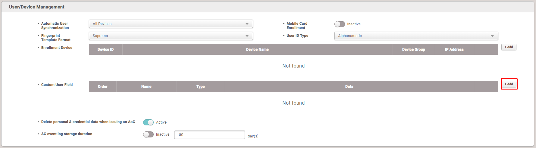 Old revisions ブックに追加 PDF の出力 全て展開する/折り畳む This is an old revision of the document! システム構成, BioStar 2, カスタムユーザーフィールド カスタムユーザーフィールドの生成 ユーザー情報に対する追加的なフィールドが必要な場合は、カスタムユーザーフィールドを追加して使用することができます。 この機能はBioStar 2バージョン2.2.1以上で使用できます。 検索ウィンドウではカスタムフィールド値を検索できません。 カスタムフィールドとユーザーをCSVファイルに移動することができます。 1. 設定 > サーバーをクリックしてください。 2. ユーザーおよびデバイス管理タブのカスタムユーザーフィールドから、+追加をクリックしてください。 生成できるカスタムユーザーフィールドの種類は3つです。 文字入力欄:このフィールドには32字まで入力できます。 数字入力欄:このフィールドには10字まで入力できます。 選択欄:このドロップダウンボックスには最大20個のオプションを作ることができます。 選択欄の項目はセミコロン(;)で区分します。 3. カスタムフィールドの追加が終了したら、ページ下にある確認をクリックします。 4. ユーザーメニューに戻ると全ての既存ユーザーに対して追加フィールドが表示され、新しいユーザーを追加しても該当フィールドが表示されます。