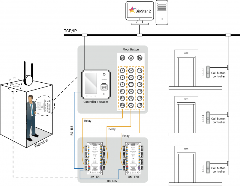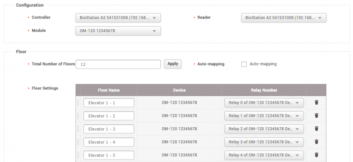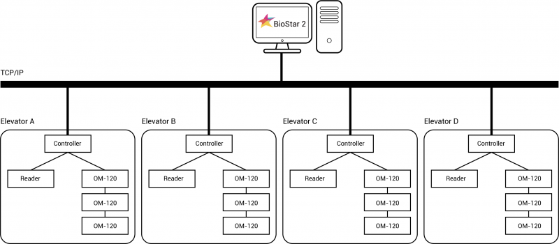 • BioStar 2の各エレベータ構成は、最大192フロア(12リレーx 16 OM-120)を制御できます。
