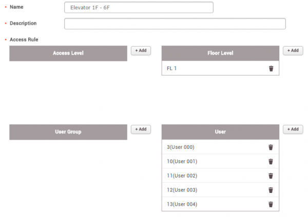上記の設定で、5人のユーザー(ユーザー3, 10, 11, 12, 13)がエレベーター1の1階から6階にアクセスできるボタンを使用できます。