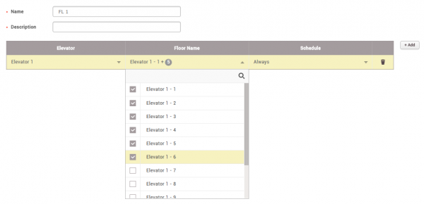 アクセスコントロールメニューでフロアレベル追加をクリックします。登録済みのエレベータを選択し、アクセス権限を設定する各フロアの名前を選択します。各エレベータが動作するフロアレベルを設定する作業です。
