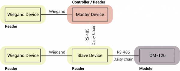 1つのコントローラーに対して、RS-485デイジーチェーンを使用して最大16台のOM-120の接続ができ、AUX入力もサポートします。 さらに、アンチパスバックゾーンや火災報知ゾーンなどの機能と一緒に使用することもできます。
