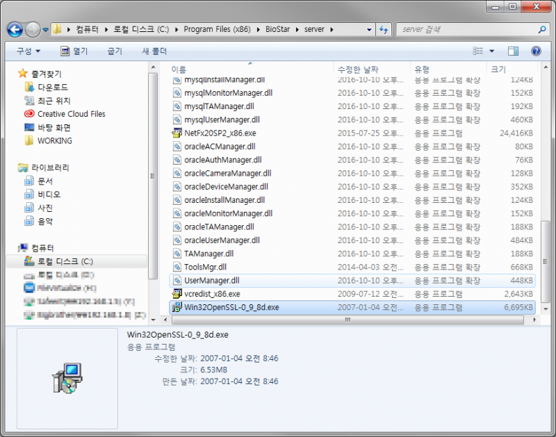 이전 판 책에 추가 PDF로 내보내기 Fold/unfold all 책 생성기 내 책으로 이 페이지 추가 책 생성기 내 책에서 이 페이지 제거 책 관리 (0 페이지) 도움말 BioStar 1, 오디날, 오류 오디날 찾기 실패 오류 해결 방법 이 문서는 BioStar 1을 실행할 때 발생하는 “오디날 찾기 실패”(2821, 354) 오류를 해결하는 방법에 대해 설명합니다. 원인 이 문제는 libeay32.dll 파일과 ssleay32.dll파일이 Windows 시스템 파일과 충돌하거나 최신 버전의 libeay32.dll 파일과 ssleay32.dll파일이 설치되어 있을 때 발생합니다. 해결 방법 1. 시작 > 제어판 > 프로그램 및 기능으로 이동하십시오. 2. 이미 설치된 OpenSSL을 제거하십시오. 3. Windows 폴더로 이동하여 libeay32.dll 파일과 ssleay32.dll파일이 삭제되었는지 확인하십시오. 파일이 폴더에 존재한다면 수동으로 삭제하십시오. 32비트 운영체제: c:\Windows\System32 64비트 운영체제: c:\Windows\SysWow64 4. C:\Program Files\BioStar\server 폴더로 이동한 뒤 Win32OpenSSL-0_9_8d.exe 파일을 관리자 권한으로 실행하여 OpenSSL을 다시 설치하십시오.