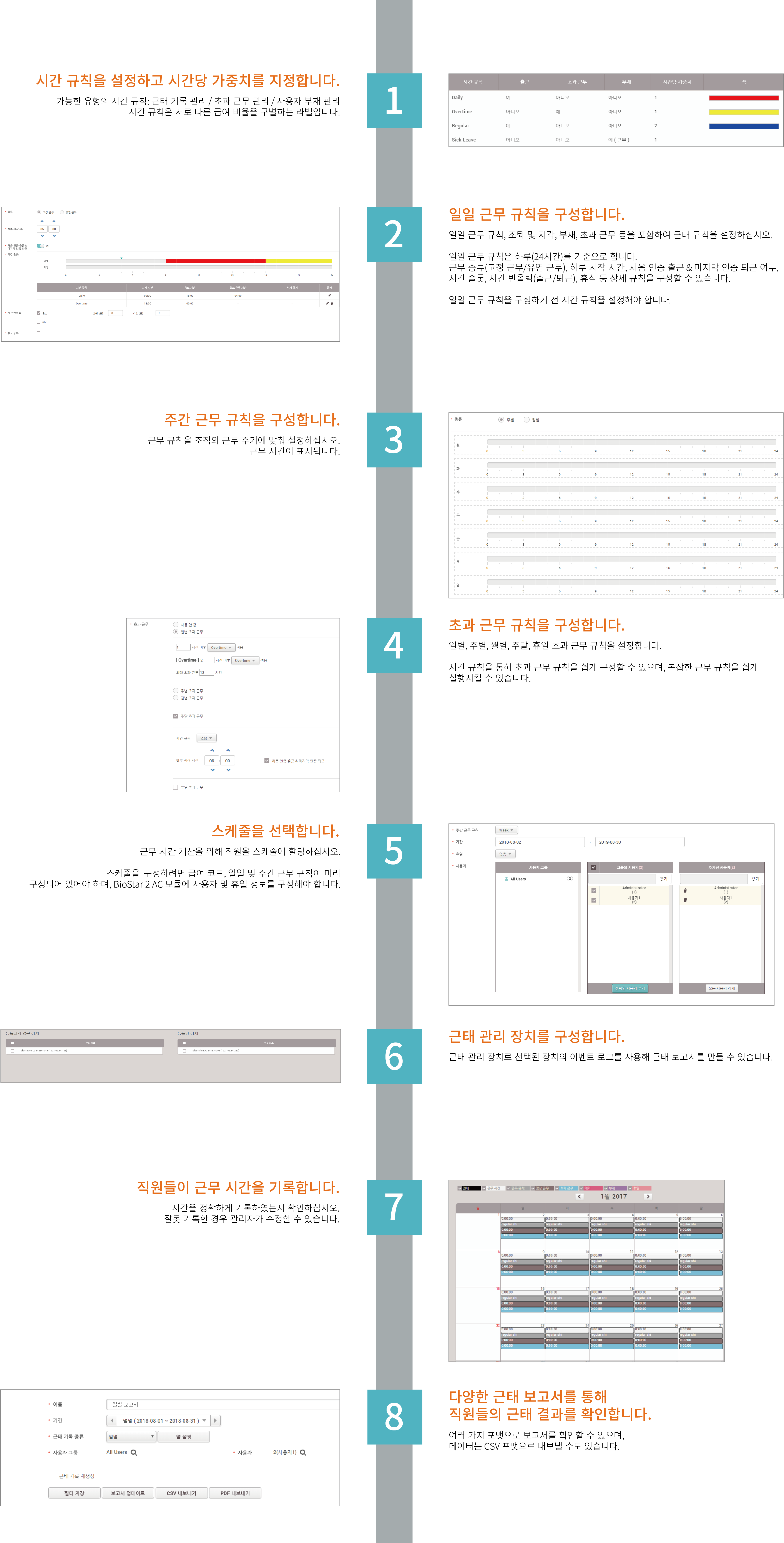 이전 판 책에 추가 PDF로 내보내기 Fold/unfold all 책 생성기 내 책으로 이 페이지 추가 책 생성기 내 책에서 이 페이지 제거 책 관리 (0 페이지) 도움말 문서의 이전 판입니다! 시스템 구성, BioStar 2, Time and Attendance, 근태 관리 BioStar 2 근태 관리 작업하기 BioStar 2의 근태 관리는 구성하기 쉽고 직관적인 타임 카드 기능을 사용해 구성원의 근무 시간을 보다 효율적으로 관리하도록 도와줍니다. BioStar 2 초과 근무 규칙 기능은 관리자로 하여금 다른 시간 규칙들과 함께 초과 시간을 쉽게 계산하고 구성할 수 있도록 합니다. 다음과 같이 시간 및 근무 규칙을 구성하여 구성원의 근태를 효율적으로 관리해 보십시오. 참고 BioStar 2 근태 관리 시스템 소개