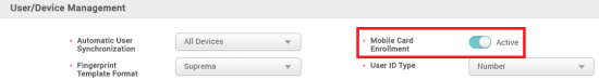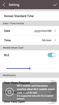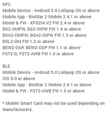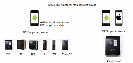 이전 판 책에 추가 PDF로 내보내기 Fold/unfold all 목차 모바일 스마트 카드 발급하고 사용하기 BioStar 2 구성하기 모바일 스마트 카드 발급하기 스마트폰 구성하기 블루투스 사용하기 데모 비디오 문서의 이전 판입니다! 시스템 구성, BioStar 2, 모바일 스마트 카드 모바일 스마트 카드 발급하고 사용하기 BioStar 2.4.1에서부터 슈프리마 2세대 단말기와 Xpass S2에서 휴대폰을 스마트 카드로 사용할 수 있습니다. 안드로이드 제품은 2세대 단말기와 NFC 호환이 가능하며, iOS 제품의 경우 NFC 기능이 없기 때문에 FaceStation 2-AWB와 같이 블루투스 기능을 갖춘 단말기에서만 지원됩니다. 모바일 스마트 카드는 아래 버전에서 지원됩니다. Host Card Emulation(HCE)은 모바일 스마트 카드 기능을 구현하는 데 사용되었습니다. 대부분의 최신 안드로이드 제품은 HCE를 사용하지만 일부 제품에서는 지원되지 않을 수 있으므로, 제조사에 문의하거나 제품 사양을 확인하여 휴대폰이 HCE를 지원하는지 확인하십시오. NFC 및 블루투스 통신 사양은 제조사나 모델에 따라 다르며, 성능에 차이가 있을 수 있습니다. 아래 표는 내부적으로 실시한 테스트 결과입니다. 내부 테스트는 국내 제품으로 실시하였으며, 각 제품의 사양은 나라마다 다를 수 있습니다. NFC 지원 여부는 동일한 모델이라도 제조일자에 따라 다를 수 있습니다. BioStar 2 구성하기 1. BioStar 2에 로그인하십시오. 2. 모바일 스마트 카드의 포맷을 설정하십시오. 스마트 카드 발급하기를 참조하십시오. 3. 설정(Setting) > 서버(SERVER)로 이동하십시오. 4. 모바일 카드 발급(Mobile Card Enrollment)을 활성화하십시오. 5. 경고 팝업이 표시됩니다. 6. 확인(Ok)을 클릭하십시오. 7. 장치(DEVICE) 메뉴로 이동하십시오. 8. 장치를 선택하십시오. 9. 인증(Authentication) 탭의 스마트 카드 레이아웃(Smart Card Layout)에서 설정한 스마트 카드의 레이아웃(Layout)을 선택하십시오. 10. 확인(Apply)을 클릭하십시오. 모바일 스마트 카드 발급하기 1. 사용자(USER) 메뉴로 이동하십시오. 2. 사용자 추가(ADD USER)를 클릭하십시오. 3. 이름, ID, 그룹과 같은 사용자 정보를 입력하십시오. 4. 권한 등급(Operator Level)을 선택하십시오. 기본 사용자 등급으로 일반 사용자(User)를 사용할 수 있습니다. 5. 모바일 애플리케이션으로 로그인할 때 사용할 로그인 ID(Login ID)와 암호(Password)를 입력하십시오. 6.+ 지문(+Fingerprint) 메뉴에서 사용자 지문을 등록하십시오. 7. + 카드(+ Card)를 클릭하십시오. 8.카드 종류(Card Type)에서 스마트 카드(Smart Card)를 선택하십시오. 9. 장치(Device)를 선택하십시오. 10. 스마트 카드 종류(Smart Card Type)를 선택하십시오. 11. 지문을 선택하십시오. 12. 모바일 카드 발급(Issue Mobile Card)을 클릭하십시오. 13. 확인(Apply)을 클릭하십시오. 모바일 카드 인증 모드는 장치의 인증 모드(카드 또는 카드+지문)를 따릅니다. BioStar 2.6을 사용하는 경우, 모바일 카드를 비롯한 스마트 카드에 대해 개인 인증 모드를 설정할 수 있습니다. 스마트폰 구성하기 1. 스마트폰에서 NFC 기능을 켜십시오. (iOS 스마트폰의 경우, 블루투스를 켜십시오.) 2. 플레이스토어를 실행하십시오. (iOS 스마트폰의 경우, 앱스토어를 실행하십시오.) 3. BioStar 2 모바일 애플리케이션을 내려받아 설치하십시오. 4. subdomain과 크리덴셜을 입력하십시오. BioStar 2 클라우드가 구성되지 않은 경우, BioStar 2 클라우드와 Mobile 앱 설정하기를 참조하십시오. 5. 로그인하십시오. 6. 모바일 스마트 카드(MOBILE SMART CARD)를 클릭하십시오. 7. 카드를 눌러 등록하십시오. 8. 모바일 애플리케이션이 실행된 상태에서 슈프리마 장치에 스마트폰을 스캔하십시오. 9. 지문을 스캔하여 인증을 완료하십시오. 블루투스 사용하기 1. 스마트폰에서 블루투스 기능을 켜십시오. 2. BioStar 2 모바일 애플리케이션에 로그인하십시오. 3. 화면 우측 상단의 기어 아이콘을 눌러 설정을 실행하십시오. 4. BLE를 활성화하십시오. 5. 블루투스 모바일 스마트 카드 리딩 거리를 변경하려면 BLE의 미터를 변경하십시오. - 블루투스 기능은 FaceStation 2 AWB 모델에서만 지원됩니다(2017년 5월 기준). - NFC와 블루투스 기능은 동시에 사용할 수 없습니다. 데모 비디오 2xtraining_mobile_smart_card_video.mp4