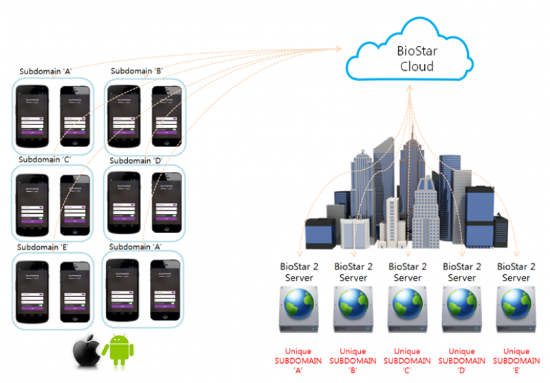 In order to use BioStar 2 Mobile App, it is required to make your local BioStar 2 server connected to the Internet and register your BioStar 2 server to BioStar 2 Cloud. Then, the local server can have an unique sub-domain which becomes an unique ID for your local server, and users can access to the local server with this unique sub-domain name.