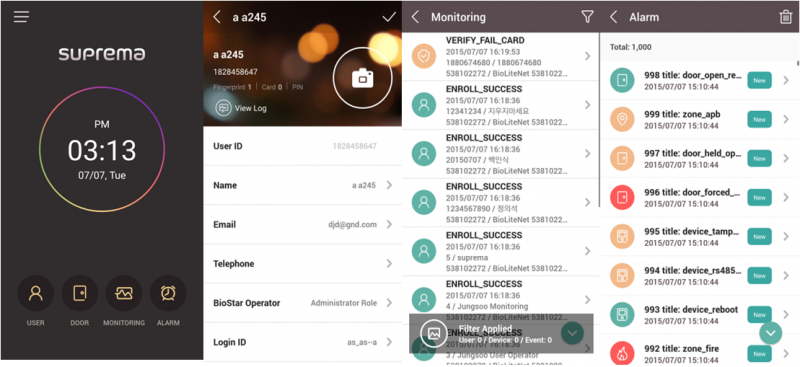 BioStar 2 supports its mobile app for both Android and iOS(you can find from the both app market by searching BioStar 2). With this app, users can access to their local BioStar 2 server anywhere anytime, and can do the basic admin level of system management without having to use a desktop PC or a laptop. Also, this is quite effective when you control a device without a LCD display and menu buttons. For example, when you need to enroll a new user or block a certain user, originally it’s necessary to go to your workstation or company’s admin desk which is physically located in a difference place most of the time. But, with the mobile app, you can simply check and guide an user enrollment not only to a device near to you and but to synchronize to all the connected devices without going through your local BioStar 2 server.