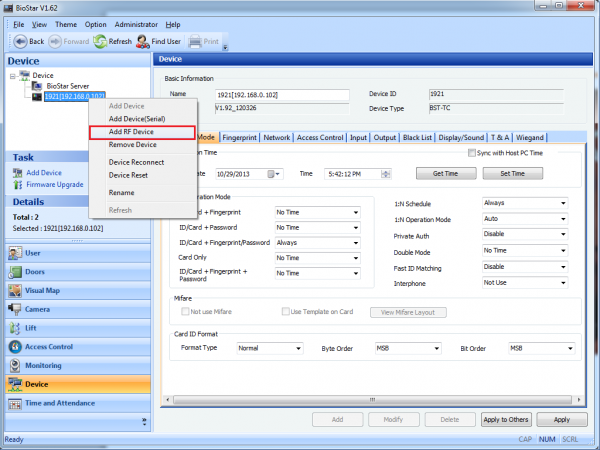 3. After connecting a Wiegand reader to your device, right-click your device in the Device pane and choose Add RF Device.