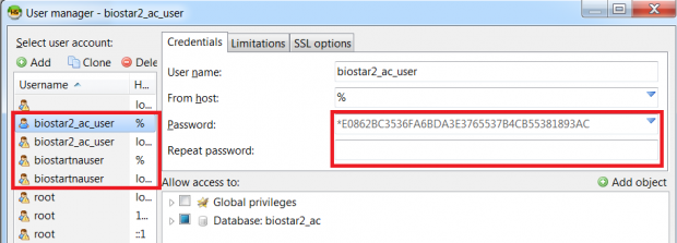 6. Click on each default users (biostar2_ac_user & biostartnauser) and change the password.