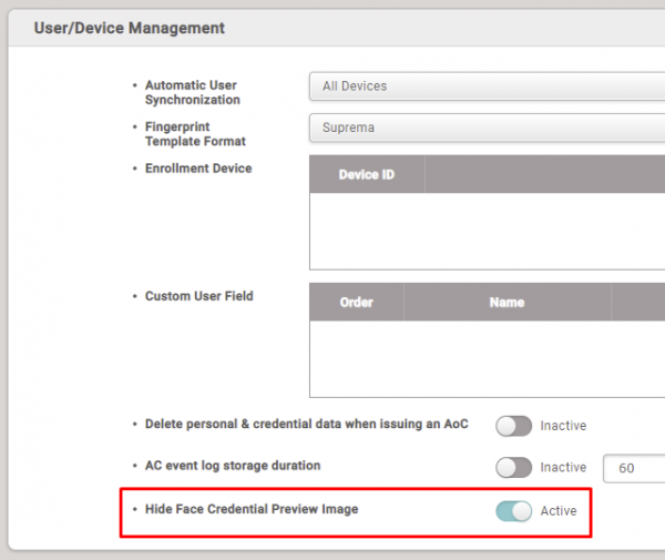 Old revisions Add to book Export to PDF Fold/unfold all Table of Contents Added Hide Face Credential Preview Image Option How to apply the 'Hide Face Credential Preview Image' function How it shows after applying 'Hide Face Credential Preview Image' 1) Face credential: FaceStation 2, FaceLite 2) Visual Face credential: FaceStation F2 3) Smart card with Visual Face credential: FaceStation F2 Book Creator Add this page to your book Book Creator Remove this page from your book Manage book (0 page(s)) Help Added Hide Face Credential Preview Image Option Affect Products & Versions BioStar 2 BioStar v2.8.16 or above On the sites where face credentials are used, there were requests to block the preview of a user's face credential to protect user privacy reasons. Suprema supports the function that does not show the preview of the face credential from BioStar 2.8.16 by reflecting the market requirements. How to apply the 'Hide Face Credential Preview Image' function Login BioStar 2 server and go to [Settings > Server > User/Device Management] part. Active 'Hide Face Credential Preview Image' by toggle.. How it shows after applying 'Hide Face Credential Preview Image' 1) Face credential: FaceStation 2, FaceLite Before enrolling face After enrolling face 2) Visual Face credential: FaceStation F2 Before enrolling visual face After enrolling visual face 3) Smart card with Visual Face credential: FaceStation F2