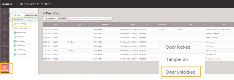 In previous versions of BioStar 2, Door open logs were limited to “Door unlocked” in Monitoring Menu in both Event log and Real- Time Log.
