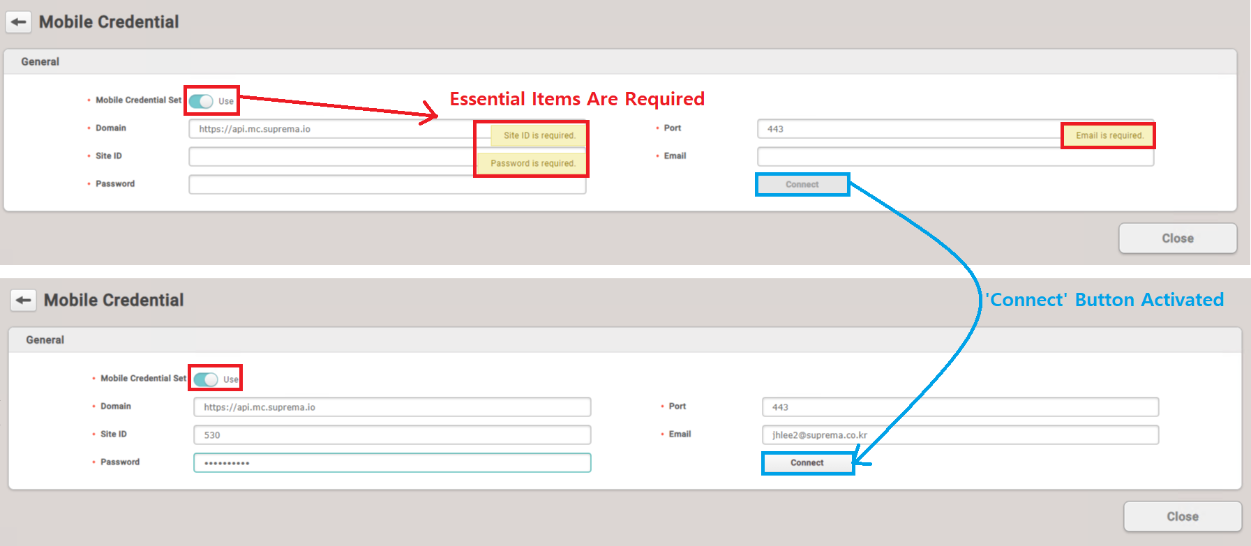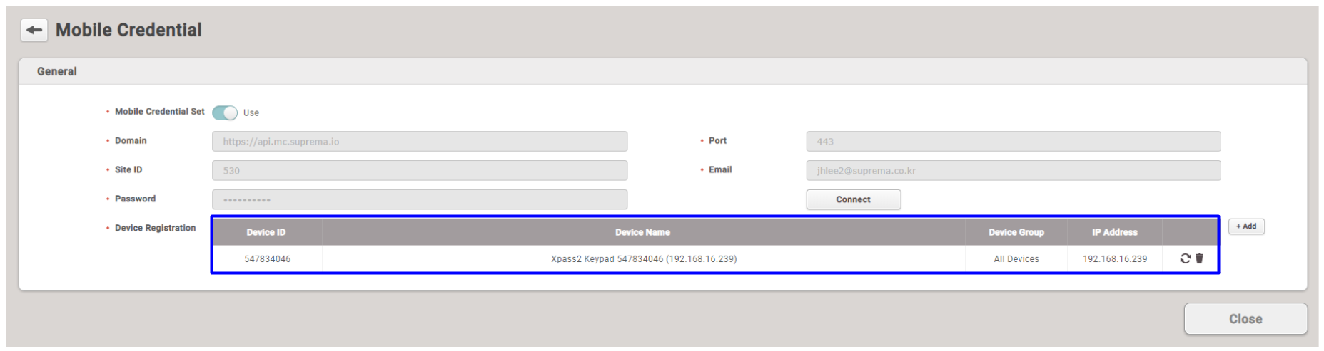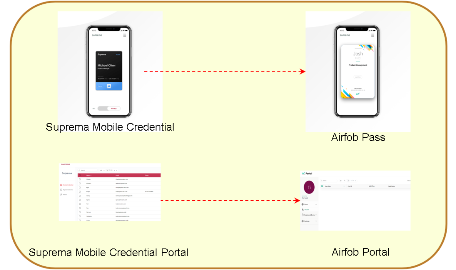 Old revisions Add to book Export to PDF Fold/unfold all Table of Contents Enhancement in Suprema Mobile Credential Usage in 2.7.14 Overview 1. Merged Mobile Credential's Advanced part into General items 2. Change of Mobile Credential Usage Book Creator Add this page to your book Book Creator Remove this page from your book Manage book (0 page(s)) Help This is an old revision of the document! Enhancement in Suprema Mobile Credential Usage in 2.7.14 Overview In the former BioStar 2, there were various limitation to register device through the Mobile Credential application and use. For example, if the user currently had devices in the running BioStar 2 server and wanted to use Suprema Mobile Access, then they had to reset the device, remove it from BioStar 2 server, and re-configure all settings back after they setup Mobile Credential settings. So Suprema improved Mobile Credential feature for user convenience in BioStar 2.7.14. The name of Suprema Mobile Credential will be changed to Suprema Mobile Access. Both of Suprema Mobile Credential and Suprema Mobile Access are a Service Name. Since 27-April-2020, Suprema will update the of the mobile app to Airfob Pass and update the name of the portal from Mobile Credential Portal to Airfob Portal. This article is for indicating the updated feature of Suprema Mobile Credential in BioStar v2.7.14. To get a concept and operation of Suprema Mobile Access (Credential), please go to the article below and review. How to Use 'Suprema Mobile Access (Credential)' What features of Suprema Mobile Access (Credential) updated in BioStar v2.7.14 is: 1. Merged Mobile Credential's Advanced part into General items Updated Part: BioStar 2>Settings>Mobile Credential 1) In BioStar 2.7.14, we merged Domain, Port, and Site ID into 'General' items. 2. Change of Mobile Credential Usage 1) When you set 'Use' the Mobile Credential Set, then 'Site ID', 'Password', and 'Email' are essentially required to input. Email, Password : the data of the user who signed in the portal. (https://mc.suprema.io) Site ID : the site ID which user created through the portal. (https://mc.suprema.io) 2) After inserting all items, 'Connect' button is activated. 3) When you click the 'Connect' button, then BioStar2 will synchronize the information to 'Airfob Portal' and check if the information is valid. (Airfob Portal is a new name of Suprema Mobile Credential Portal.) If the information is correct with ‘Airfob Portal’, then the below popup will show up. Connected. Please register devices before using mobile credential. If the information mismatched with 'Airfob Portal', then error pop-up will show up and decline setting up the connection. If ONLY 'Site ID' is wrong, connection will be set up but will show up error pop-up window to correct 'Site ID'. 4) You can add new devices in the 'Site' through '+ Add' button on the right side. Once you click [+Add] in Device Registration, there will be the devices in Device Menu of BioStar2. Please note that XPass 2 is only available to use for Suprema Mobile Credential. We will update soon. 5) If you have registered devices already to Airfob portal, it will be deployed as blue box at the bottom. If you click 'Sync' button on the right side of the device, the key for connection setup will be overwritten on the device. If you click 'Delete' button on the most right side of the device, device will be automatically removed from Airfob Portal and key will be deleted from the device at the same time. 6) You can sort devices by 'Device ID' and 'Device Name'. 7) When you try to set Mobile Credential Set, 'Not Use' with registered devices in the list, then the pop up message will come up. ONLY IF all devices' synchronization key deleted well, then Mobile Credential Set will turn to 'Not Use'. Otherwise, 'Use' status will be kept and leave failed devices in the list. 8) You can check Mobile Credential configuration change from Audit Trail. (Appendix. Terminology about Mobile Solution) Suprema Mobile Credential changes to Airfob Branding UI with New Features on April 20-2020.