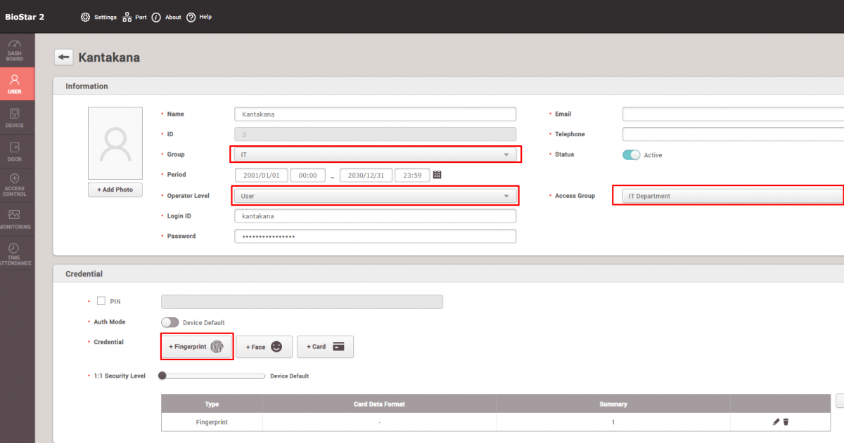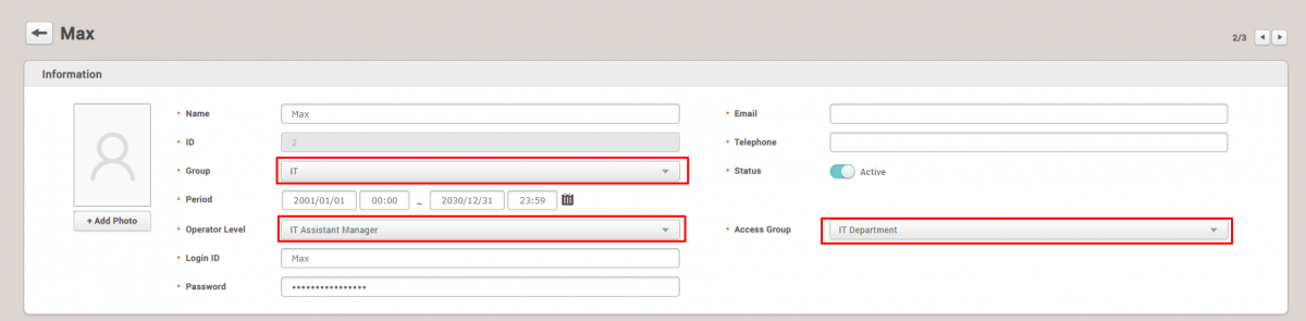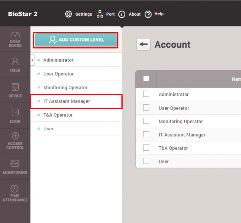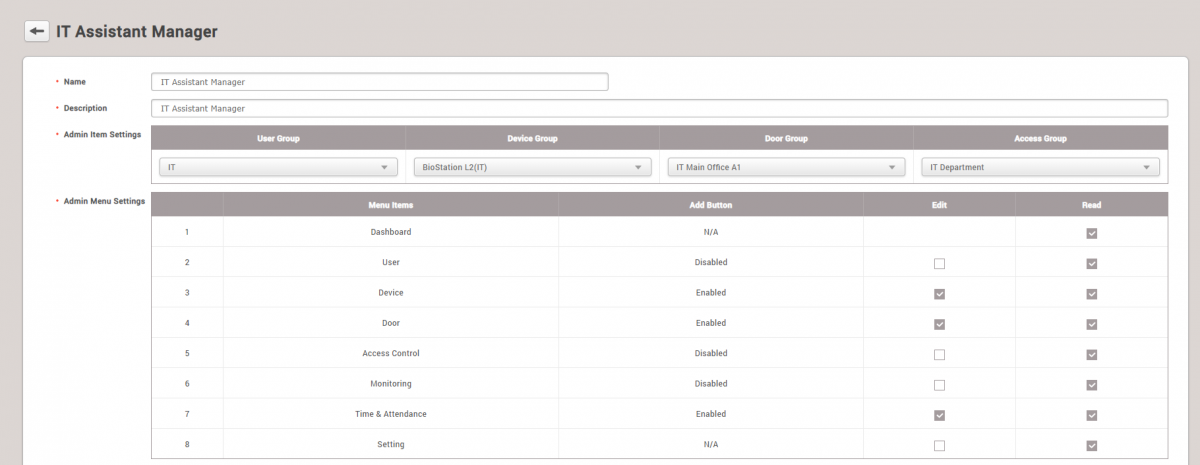 Old revisions Add to book Export to PDF Fold/unfold all Book Creator Add this page to your book Book Creator Remove this page from your book Manage book (0 page(s)) Help This is an old revision of the document! How to Configure a Custom Level(Example for 2.6.3) Below can be an example of how you can realize features that are changed in 2.6.3 Employee name: Max Employee title: IT Assistant Manager Employee group(User Group): IT Device used when entering from the main entrance(Device Group): BioStation L2 Working Space(Door Group): IT Main Office A1 Department(Access Group): IT Department Juunior Employee: Name: Kantakana Title: IT Specialist Admin Item Settings and Admin Menu Settings can be properly configured to reflect the example above. This user is an Assistant Manager, he can Edit or Read records for Device, Door, and Time and Attendance in order to manager his subordinate workers. But he can only Read information of User, and cannot edit general Account Settings of the system as well as who has access to certain areas(Access Group). You will be able to see in Step 7 when you set Custom Level, you can see how this can be implemented. 1. Because Max belong to IT Department, we can setup Access Group and Access Level via Access Control menu. 2. When Creating Access Group, you will be prompted to create Access Level - Assigning a user will not be necessary as we will assign a user to a specific user group, which will do it later on in this material. - We will also create Door Group in the next step, you can come back to this step later to assign proper User Group for Access Group, and Door Group for Access Level 3. Let's go to Door menu to setup Door Group, right click on All Doors and click “Add Group” to add Door Group - You can see the Door Group created below it, here it is named to IT Main Office A1. - You can assign this door to the Access Group “IT Main Office A1” that we created previously 4. Now move on to Device Tab and just as we've done it, right click on All Devices to click “Add Device Group” - You can see the Device Group created below it, here it is named to BioStation L2(IT) 5. Click the device, and then assign its group to Device Group “BioStation L2(IT)” that we just created. 6. Let's go to Settings → Account → Add Custom Level 7. Here it will be named “IT Assistant Manager”, and we will set all of the Admin Item Settings that we created previously - We will create User Group in the next step, and then you can come back to this menu to assign the created User Group. - This user will only have “Read” rights for all of the Admin Menu Settings 8. Finally, let's create a user by going to User menu - Likewise, right click on All Users and click “Add User Group”, here it is named “IT” 9. Add a new user and set appropriate Group(User Group), Operator Level, and Access Group that we just created. - set the Login ID and Password that you can remember well - at this point you can go back to step 7 and assign the created custom level to the user group that this user has set → this will automatically set the user Max to be accounted for the custom level - also try to enroll a fingerprint with one of your fingers for this user *At this point please go back to step 2, to assign propery User Group and Door Group that we created for the Access Group and the Access Level 10. Now when you log out and login as Max, you can see that privilege of this user is limited - below is the example of this user not being able add any user on User menu or edit Access Group, Monitoring, and Time Attendance menus - but as it was mentioned earlier this user has rights to edit/read Device and Door 11. Now to test this, I will create a user named Kantakana, who is an IT Specialist working under Max in the IT Department that also belongs to the User Group of “IT.” This user will have an operator level of just “User” which is set by default that is only able to read his own information as well as his own Time Attendance records. - to do this please log out of Max's account, and then log back in as the default administrator(User ID = 1). - go to User menu and click “Add User” and then create a user as below. - try enrolling fingerprint of this user with your device using one of your fingers. 12. Now log out and log back in as Max, then go to Monitoring menu → Real-time log. Put the finger that you enrolled for Kantakana on the device. You will be able to see that Max can monitor when his associate employee Kantakana showed up to work by looking at when he authenticated. When you authenticate the fingerprint enrolled for Max on the device, you can also see that Max has privilege to monitor his own logs. 13. In contrast, when you login as Kantakana. You can see that he can only Read his own User information as well as his Time Attendance records, but he cannot edit anything on it as his privilege is limited. - thus if he wants to view his own monitoring records as well as to fix them in case if he comes work late or goes for a leave, or the system is down so that it failed to record his attendance properly, he has to contact his manager Max to edit these information.