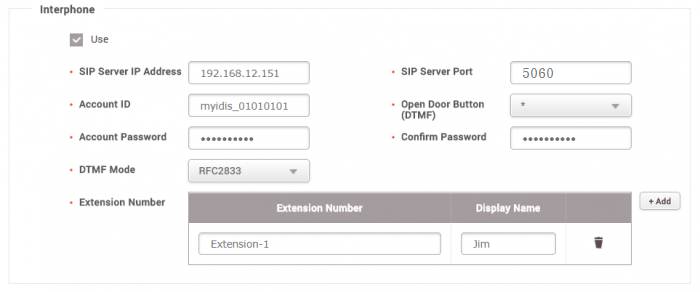 Old revisions Add to book Export to PDF Fold/unfold all Book Creator Add this page to your book Book Creator Remove this page from your book Manage book (0 page(s)) Help This is an old revision of the document! System Configuration, BioStar 2, SIP, “Videophone” How to Configure SIP Authentication ID Before BioStar 2.6 you could only configure an Account ID and Extension Number with numbers for the interphone feature. In BioStar 2.6 and above, you can configure the Account ID and Extension Numbers with a combination of alphabet, number, and special characters up to 32 characters. You will need a SIP server to use the interphone feature of A2 and FaceStation 2. If you would like to configure a SIP server, refer to the article: SIP based VoIP server for BioStation A2 & FaceStation 2 Configuring Interphone with Authentication ID 1. Log in to BioStar 2 with an administrator account with DEVICE configuration privileges. 2. Click on your device to open the device configuration page. 3. Open Advanced > Interphone 4. Check Use. 5. Configure all fields as necessary. Open Door Button (DTMF) is the button that will open the door in your SIP client SIP server port should be set to **5060*