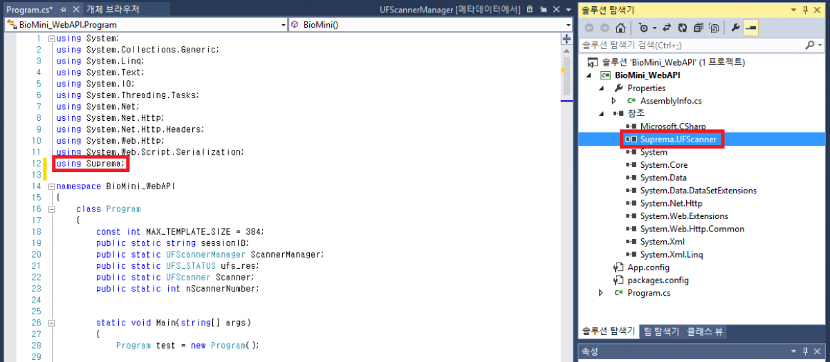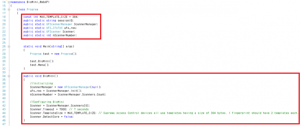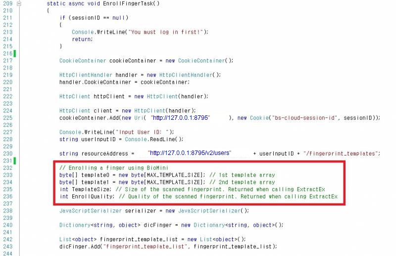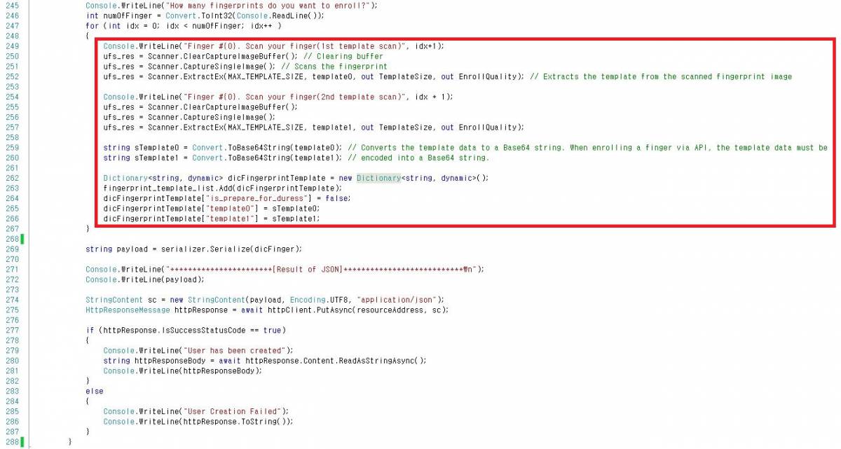 Old revisions Add to book Export to PDF Fold/unfold all Table of Contents How to enroll fingerprint on BioMini via BioStar 2 API Step 1: Step 2: Step 3: Step 4: Book Creator Add this page to your book Book Creator Remove this page from your book Manage book (0 page(s)) Help System Design & Dev., BioStar 2 How to enroll fingerprint on BioMini via BioStar 2 API You can enroll fingerprint on BioMini by calling BioStar 2 API. BioMini is only enrollment device but can't authenticate fingerprint. Thus, it doesn't appear in GET/devices. To utilize BioMini with BioStar 2 API, you should download BioMini SDK and install it. If you need BioMini SDK, contact our sales team (sales_id@supremainc.com). Step 1: Install BioMini SDK and copy two DLL files in the path (C:\Program Files (x86)\Suprema\BioMini\bin). UFScanner.dll Suprema.UFScanner.dll Paste the copied files to your project. Step 2: In your project, add the DLL titled “Suprema.UFScanner” as reference and add the namespace Suprema. Step 3: Declare variables and constant. Then, initialize and configure BioMini. Line 18, 44: The size of fingerprint template is 384 bytes. Step 4: Create new function in order to enroll fingerprint on BioMini. Line 233~236: 1 fingerprint should have 2 templates respectively so that you need to declare two variables for storing each template. Line 247~267: Scan Fingerprint with BioMini. (One fingerprint with two templates) If you would like to get overall sample code for C#, contact us (tech@supremainc.com).