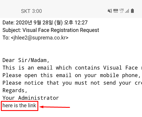 Old revisions Add to book Export to PDF Fold/unfold all Book Creator Add this page to your book Book Creator Remove this page from your book Manage book (0 page(s)) Help This is an old revision of the document! How to Enroll Visual Face Credential From BioStar 2.8.6, Suprema starts to support FaceStation F2, which is our first model of supporting Visual Face credential. If you would like to check more information about FaceStation F2, please check on the linked page. (Link) There are three ways to register your Visual Face credentials; registering through BioStar 2, registering user credentials directly from the device menu, or registering through a mobile device. In this article, we will look at how to register through BioStar 2, which is the basic of user credential registration, and how to easily register untact, which is newly supported method by Suprema. 1. Enroll Visual Face credential via BioStar 2 1) BioStar 2.8.6 or higher supports Visual Face Credentials by default. 2) Add the FaceStation F2 device to your BioStar 2. 3) In the BioStar 2 user menu, select a user who wants to register Visual Face credentials. 4) Select Visual Face from the Credential list. 5) Select your FaceStation F2 device and click the +Add button on the left to set it as the Nth credential to be registered. 6) After clicking the Scan button, place your face in front of the FaceStation F2 device. 7) When scanning is complete, your face is checked on the screen. 8) You can use this as a user Profile Image. 9) If you want to register as a photo without scanning the user's face, please press the Upload Image button. 10) Select a user's picture and register it. Supported image file formats are JPG and PNG. Supported image file size : minimum 250 x 250, maximum 1280 x 1280 Supported number of image files : maximum 2 per each user 2. Enroll Visual Face via Visual Face Mobile Enrollment This function requires the use of BioStar 2 Cloud service. BioStar 2 license is required to use Cloud service. To purchase a license, contact your place of purchase or your Suprema sales representative. Contacts 1) Enable BioStar 2 cloud service. 2) Go to BioStar 2> Settings> Email Contents and write an email that the customer will receive when sending the Visual Face Mobile Enrollment link. 3) This function is performed through the SMTP setting. SMTP settings are the same as in Email Alert of Trigger & Action. 4) When the setting is complete, enter the address to receive the test mail in Test Mail Recipient Address and click Send Mail. If your SMTP settings are correct, you will receive a test mail to the address you entered. 5) If the test mail was sent correctly, click the Apply button to save the settings. 6) Add users to BioStar 2. At this time, you must fill in the email information of this user information. 7) After creating a user, select the user who sent the mail from the user list. 8) Click the button at the top right corner, then click Send Visual Face Mobile Enrollment Link. If the shipment is successful, a pop-up saying 'Success' will appear. 9) Take a picture of the user on a mobile device with a camera, such as a mobile phone or tablet. 10) Click the link received by e-mail on the mobile device with your photo. 11) Follow the guide shown on the screen to register your face photo. Supported image file formats are JPG and PNG. Visual Face Enrollment link sent will expire after 24 hours. 12) If the Visual Face credentials are well registered, it is confirmed that the link is invalid on the final screen.