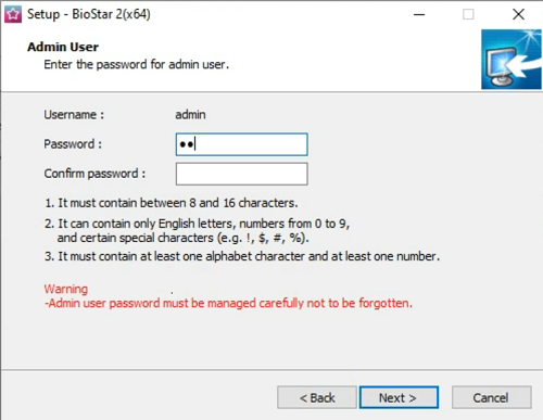 Old revisions Add to book Export to PDF Fold/unfold all Book Creator Add this page to your book Book Creator Remove this page from your book Manage book (0 page(s)) Help This is an old revision of the document! BioStar 2, SMTP, email How to Install BioStar 2 with Maria DB BioStar 2 is a web-based, open, and integrated security platform that provides comprehensive functionality for access control and time & attendance. There are two types of databases to use in BioStar 2 (Maria DB and MSSQL). The databases each have different methods for installing BioStar 2. Here, we will cover how to install BioStar2 with Maria DB step-by-step. Before installing BioStar 2, please refer to the BioStar 2 Installation Guide at BioStar 2 Package to check the system requirements for your computer. BioStar 2 Installation 1. Download the latest BioStar 2 Setup file at BioStar 2 Package. You can choose the (x64) or (x86) setup based on your computer’s system requirements. 2. After downloading the BioStar 2 setup file, right-click and click “Extract All…”. 3. Right-click the BioStar 2 Setup and run as administrator. 4. Select Setup Language. 5. After carefully reading the license agreement, select “I accept the agreement” and click “Next >” to proceed. 6. The first account that will be used to login to BioStar 2 will be the admin. Customize the admin password based on the password requirements displayed at the Setup. Please note that it is difficult to recover the admin password, so make sure to not forget the admin password once you have set it. Click “Next >” to proceed. 7. Choose “Express installation” as the Database installation type. 8. Set the password for the Maria DB root account. The procedure is very similar to the setup for the admin password. 9. Select destination location for the installation. 10. Select the folder for the Encrypt Key Storage Directory. The encrypt key is critical for operating BioStar 2, and please do not alter the location of the file or the file once you have set the location. Click “Next >” to proceed. 11. Read the Responsibility for protecting personal information. 12. Here, you can customize the port setting. Change the default port setting if that port is being used. 13. Select the components to be installed at BioStar 2. Choose the USB Device Agent if the installation of the USB Fingerprint Reader (BioMini Plus 2) or the USB Card Reader (DE620) is required. If you install the USB Device Agent, you will need to restart your computer to complete the installation process. 13-1. If BioMini Plus 2 is currently connected to your PC, please remove it from the USB port before installation. 13-2. Install the certificate for the Thumbprint. 13-3. Install the Suprema Fingerprint Scanner Driver and the InstallDriver for the USB Card Reader(DE620). 14. After the installation process has been completed, open BioStar 2 Settings to confirm the system status. Check the Service Status and the HTTPS Port. How to Install Certificate for BioStar 2 If you try to open BioStar 2 right after installation, you will get the following privacy error message. Currently, there is no certificate installed at BioStar 2. So, the web protocol is displaying “Not secure.” Please refer to How to configure HTTP or HTTPS protocol for steps to install the certificate for BioStar 2. Then, it will be displayed as “Connection is secure.” Note: For the best experience at BioStar 2, use Google Chrome as the browser to access BioStar 2.