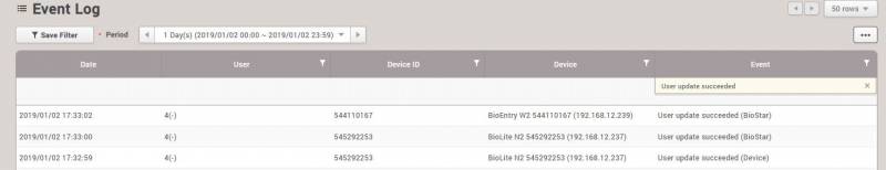 Old revisions Add to book Export to PDF Fold/unfold all How to sync user data enrolled/edited from the device What is the device enrolled/edited user data sync? User data sync was only supported from the server side only up to 2.7.0 version. From BioStar 2 2.7.1v, the device side enrolled/edited user data can be automatically synced to the other devices. This functionality works by checking user enrolled/edited logs from the server side. When the user enroll/edited logs are uploaded to the server, the server pulls the user data from the device, and updates it, and syncs to the other devices. In case of having the same user data in the server, the device side user data are merged to the server DB. In other words, the already existing user fields in the server side won't be affected and only the vacant user fields are updated as below. Please note that the ‘user data delete’ from the device won't affect the server side user data. How to use 1. Go to the server setting and select 'All Devices(including user update from device)' and apply. 2. Enroll or edit users from the device. The user update succeeded logs can be seen from the monitoring logs as below. - User update succeeded (BioStar): it refers user update event by syncing data from server to device. - User update succeeded (Device): it refers user update event occurred at the device side. Note that there can be 'Fail to save to the server DB' events when the server fails to update the DB. In this case, the updated user data are only reflected on the device side. Please note that it can affect the server response speed when massive user update logs are generated by using this feature heavily.
