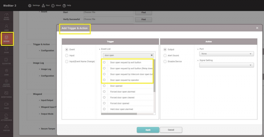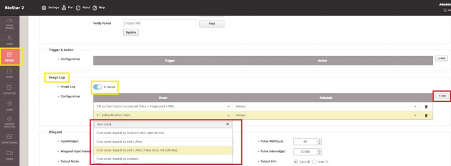 Old revisions Add to book Export to PDF Fold/unfold all Book Creator Add this page to your book Book Creator Remove this page from your book Manage book (0 page(s)) Help This is an old revision of the document! BioStar 2, Monitoring, door, logs Improved door open logs Affected Version: BioStar 2.9.0 or above Affected Products & Versions: BioStation 3 Version 1.0.0 FaceStation F2 Version 2.1.0 (to be released) BioLite N2 Version 1.5.0 In previous versions of BioStar 2, Door open logs were limited to “Door unlocked” in Monitoring Menu in both Event log and Real-Time Log. [Shown below] BioStar 2 Version 2.9.0 Newly Added Door Open logs - Door open requested by exit button - Door open requested by the operator - Door open requested by exit button (Replay does not activate) Now BioStar 2 Version 2.9.0 consists Door Open logs in details. Detailed door open logs can be found in Monitoring menu in both Event Log and Real-time Log. Furthermore, these detailed door unlocked functions could be added on to trigger & action, and image log. Device → Trigger & Action Device Image Log Newly added logs can be found in Monitoring menu in both Event Log and Real-time Log Door open request by exit button Door open request by the operator when the operator clicks open button from BioStar 2 Door status menu, the door open time will be using the same setting as the Door open time. Example Case ) Operator uses Monitoring → Door Status Menu to unlock the door