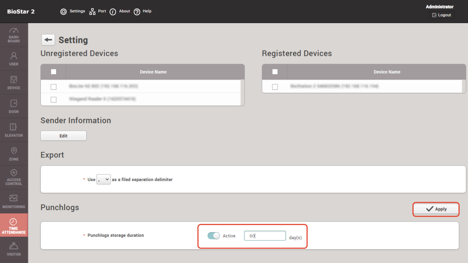 Old revisions Add to book Export to PDF Fold/unfold all Table of Contents Supports Deleting Time & Attendance Punch Logs after a Certain Period 1. Cautions 1) When the function is activated, the ENTIRE T&A records that have exceeded the storage deadline as shown below: 2) It is HIGHLY recommended to back up the BioStar 2 DB before using this function. 2. How to use the function 1) Go to [BioStar 2 > Time Attendance > Setting > Punchlogs]. 2) Activate the function through the Active/Inactive toggle at the bottom of the screen, and enter the expiration date to save time and attendance records. 3) Click the [Apply] icon on the right. Book Creator Add this page to your book Book Creator Remove this page from your book Manage book (0 page(s)) Help Supports Deleting Time & Attendance Punch Logs after a Certain Period Affected Version: BioStar 2.8.17, BioStar 2.9.0 or higher version Unlike the BioStar 2 AC, in the case of the BioStar 2 TA server, there was no function to automatically delete old attendance records. In the case of users who have been using BioStar 2 for a long time or who use the T&A function and sites with many T&A records, the old T&A records took up system capacity. As of BioStar 2.8.17, Suprema has improved the function to delete the records of BioStar 2 TA when the user-specified period exceeds like the existing functions of BioStar 2 AC. 1. Cautions 1) When the function is activated, the ENTIRE T&A records that have exceeded the storage deadline as shown below: Synchronized punch logs from the AC DB (records authenticated by the device) Modified punch logs manually modified by administrators, etc. Leave records manually set by administrators, etc. 2) It is HIGHLY recommended to back up the BioStar 2 DB before using this function. Once applied, all the already deleted attendance and leave records cannot be restored. Ex) If you previously set it to 30 days and then changed it to 60 days, the 30-day record corresponding to the difference between the two settings is not stored in the DB and cannot be restored. 2. How to use the function 1) Go to [BioStar 2 > Time Attendance > Setting > Punchlogs]. 2) Activate the function through the Active/Inactive toggle at the bottom of the screen, and enter the expiration date to save time and attendance records. 3) Click the [Apply] icon on the right.
