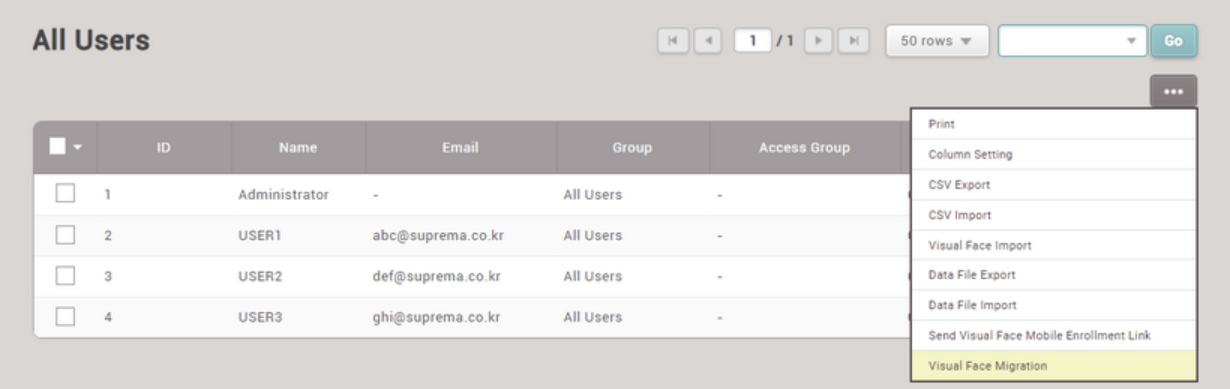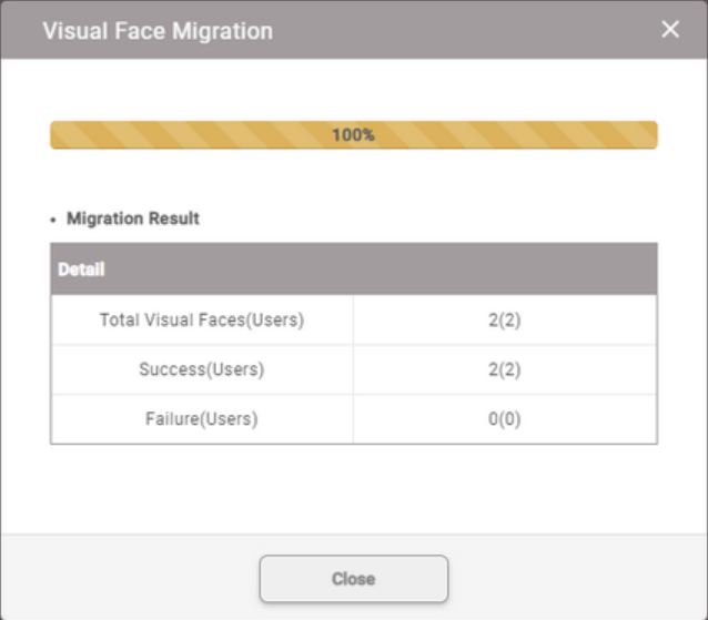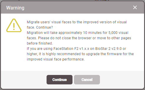 Old revisions Add to book Export to PDF Fold/unfold all Table of Contents Supports Visual Face Migration How to Use Visual Face Migration 1) Go to [BioStar 2 > User] 2) Click a on the right top and then select the [Visual Face Migration]. 3) Click [Continue] after reading the warning pop-up message, Visual Face Migration process goes on. 4) When the Visual Face Migration is complete, a result pop-up appears. You can check the total number of Visual Faces enrolled in BioStar 2, the number of migration succeeded visual faces, and the migration failed visual faces. 5) If a migration error case occurs, the list of users who have failed migration will be provided as a CSV file. You can delete the Visual Faces that have failed migration at once by clicking [Delete]. Book Creator Add this page to your book Book Creator Remove this page from your book Manage book (0 page(s)) Help Supports Visual Face Migration Affected Version: BioStar 2.9.0 or above In order to improve the usability of customers, the criteria of the algorithm for extracting Visual Face templates from photos have been updated while improving the Visual Face performance. Accordingly, even with Visual Face credentials that had no problems with registration and used in BioStar 2 v2.8.6 - v2.8.17 and FaceStation F2 v1.x.x, the latest BioStar 2, v2.9.0 and above, and FaceStation F2 v2.x.x, BioStation 3 may not be available. In Suprema, Visual Face Migration in BioStar 2.9.0 notifies which user's photo needs to be replaced so that customers who have been using Visual Face since FaceStation F2 v1.x.x do not experience inconvenience even after upgrading or adding new devices. To understand Visual Face extraction improvements, please refer to the article below: Improved Image Extraction for Visual Face Credentials The user must manually run this function. Upgrading BioStar 2 to v2.9.0 or higher version does NOT automatically check the compatibility of Visual Face. How to Use Visual Face Migration 1) Go to [BioStar 2 > User] 2) Click a on the right top and then select the [Visual Face Migration]. 3) Click [Continue] after reading the warning pop-up message, Visual Face Migration process goes on. Please notice that the migration process will take some time, and depending on the number of your Visual Face credentials, the consumed time will vary. 4) When the Visual Face Migration is complete, a result pop-up appears. You can check the total number of Visual Faces enrolled in BioStar 2, the number of migration succeeded visual faces, and the migration failed visual faces. 5) If a migration error case occurs, the list of users who have failed migration will be provided as a CSV file. You can delete the Visual Faces that have failed migration at once by clicking [Delete].