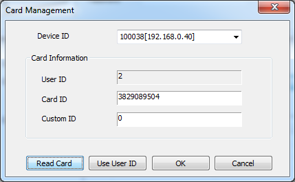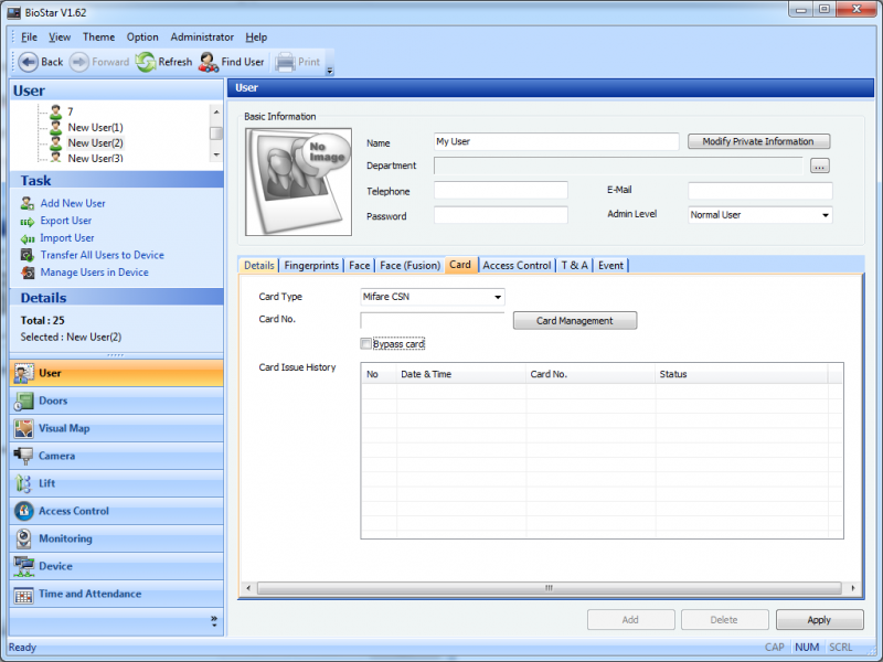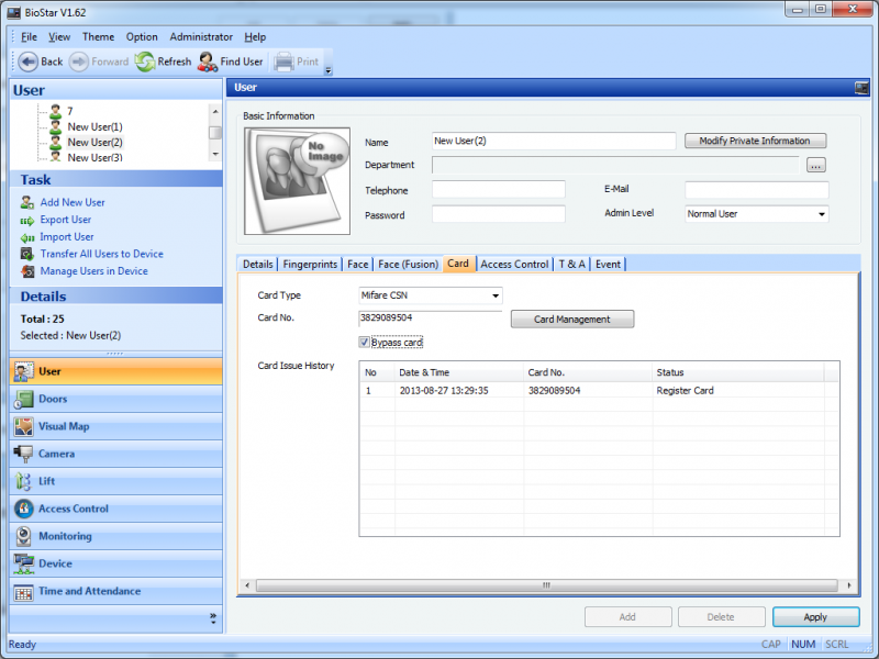 Old revisions Add to book Export to PDF Fold/unfold all Book Creator Add this page to your book Book Creator Remove this page from your book Manage book (0 page(s)) Help BioStar 1, Bypass, Card How to issue Bypass cards Bypass card allows you to be authenticated on any devices that register the card as Bypass card. You can register Bypass card on the BioStar client as follows: 1. Go to the User page, choose a user that you want to give Bypass card and click the Card tab. 2. If no card has been registered for the user, click Card Management. 3. Choose a device you want to use as a card reader from the Device ID drop-down list and click Read Card. 4. Set the Bypass card option and click Apply.