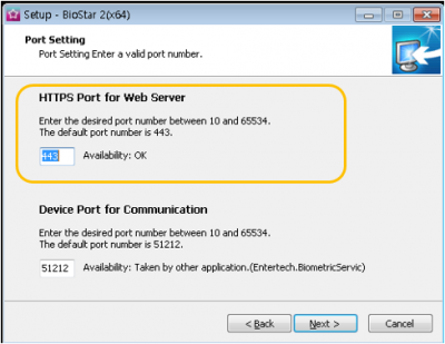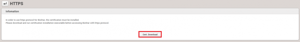 Old revisions Añadir al libro Exportar a PDF Fold/unfold all Creador de libros Añadir esta página al libro Creador de libros Eliminar esta página del libro Mostrar, modificar libro (0 página/s) Ayuda System Configuration, BioStar 2, HTTPS, “HTTP" Cómo configurar el protocolo HTTP o HTTPS A partir de Biostar 2.5, el protocolo predeterminado que utiliza el servidor web BioStar 2 es HTTPS para garantizar una mayor seguridad en la comunicación entre el servidor y el cliente. Es posible cambiar a HTTP, pero no se cifrará ninguna información en este protocolo de comunicación. A continuación se muestra la configuración del puerto para HTTPS que verá en la instalación. Utilice otro puerto si el puerto 443 está en uso. No se alarme si la conexión a su BioStar 2 Client se muestra como no segura. Esto se debe a que el certificado del servidor tiene que instalarse primero en el equipo cliente. Siga las instrucciones a continuación para resolver el mensaje de error. Si va a utilizar el protocolo HTTPS, debe aplicar el certificado (8 pasos siguientes). Si no se aplica el certificado, experimentará lentitud y otros comportamientos erráticos en el cliente web, como ninguna respuesta a los clics. Configuración para HTTPS 1. Abra los Ajustes de BioStar(BioStar Setting). Si otro servicio utiliza el puerto HTTPS predeterminado (443), cámbielo a otro valor. 2. Abra en Chrome el navegador web de BioStar 2 con https://[server IP]:[número de puerto]. Aparecerá una página de advertencia, como se muestra a continuación: 3. Haga clic en Continuar con XXX.XXX. Xx. XX (unsafe). 4. Inicie sesión con una cuenta de administrador de BioStar 2. 5. Vaya a Ajustes(Setting) > HTTPS. 6. Haga clic en el botón Descargar Cert(Cert.Download). para obtener un archivo denominado cert-register.zip. 7. Descomprima el archivo cert-register.zip y ejecute cert-register.exe. 8. En la ventana Enrolamiento de Certificación(Enrollment Certification), ingrese la dirección IP de BioStar 2 Server junto con el puerto HTTPS que asignó en el paso 4 y luego haga clic en el botón Enrolar(Enrollment). 9. Lea el mensaje Advertencia de seguridad(Security Warning) y haga clic en Sí(Yes). 10. Una vez que la herramienta haya instalado correctamente el certificado, verá la siguiente ventana para completar el proceso. Haga clic en Aceptar(Aceptar) para confirmarlo. 11. Para comprobar la instalación, reinicie el navegador web e intente abrir la página web de BioStar 2. Asegúrese de que ya no aparezca el mensaje de error que encontró en el paso 2. Para cambiar el protocolo de HTTP a HTTPS, consulte el artículo siguiente: How to change from HTTP to HTTPS