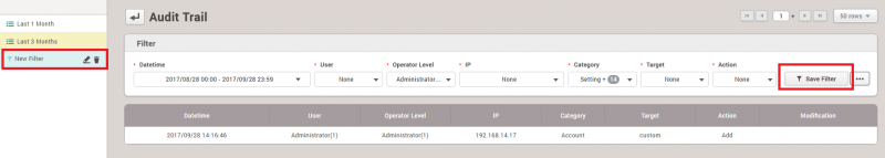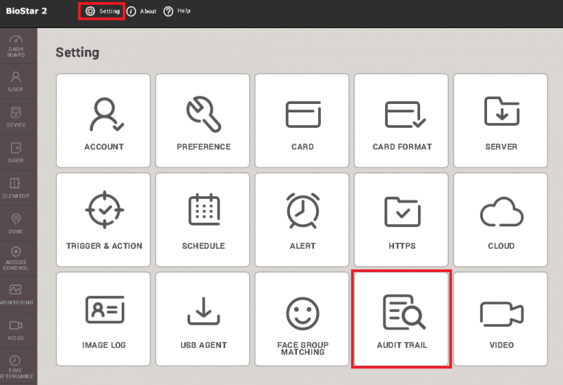 設定(Setting) > 監査記録(AUDIT TRAIL)に移動してください。監査記録画面が表示されます。