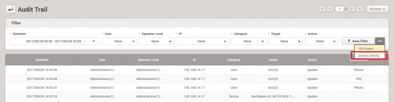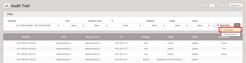 監査記録はBioStar 2.5.0の新たな機能の1つで、システム管理者の全ての行動を確認するための機能です。この機能はBioStar 2にログインしたシステム管理者が生成、修正、削除したデータが何か確認できるようサポートします。